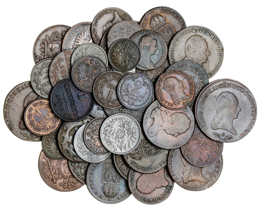 Habsburg Dynasty, Austria, Hungary and the Austrian-Netherlands, copper coins [12], including: Francis II, Kronenthaler, 1794 (KM 62.1); 2-Liards (2-Oorden) (3), 1757; 1777; 1789; 1790; additionally, Liard [2], 1777, 1778; and various others (6); additionally, Austrian Empire [32], including: 30-Kreuzer, 1807-A (KM 2149); 15-Kreuzer, 1807-A (KM 2138); 6-Kreuzer, 1800 (3), A, B, S (KM 2128); 4-Kreuzer (2), 1861-A, 1864-B (KM 2194); 3-Kreuzer (5), 1800 [4], B; C; F; S (KM 2115.3); another, 1851-A (KM 2193); Kreuzer (12), 1760-H; 1761-P; 1800 [2], B; C; 1812 [2], B; S; 1816 [4], A {2}; B {2}; 1851-A [2]; also, 1858-M; 1881; 1885 (KM 2186); Half-Kreuzer [3], 1780-W; 1800-A; 1816-A; 20-Heller (2), 1893; 1915; also, 10-Heller (2), 1896; 1916; also, 2-Heller (2), 1898, 1912; Heller, 1898; 1912; ; some lightly cleaned, otherwise generally very fine (45)