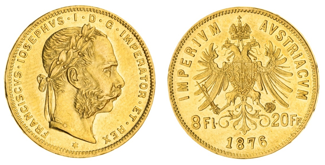(g) Austro-Hungarian Empire (1867-1918), Franz Joseph I, gold 20-Franc {8-Florins / Forints}, 1876-KB, Kremnitz (Fb 1737; KM 467), very fine
