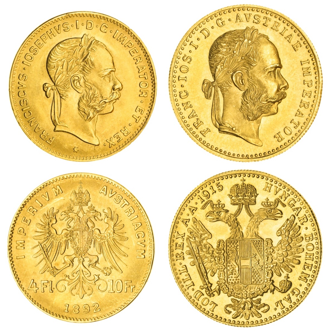 (g) Austro-Hungarian Empire (1867-1918), Franz Joseph I, Restrikes [2], gold 10-Francs {4 Florins}, '1892', as manufactured; another, gold Ducat, '1915' (cf. Fb 494; cf. KM 2267), uncirculated [2]