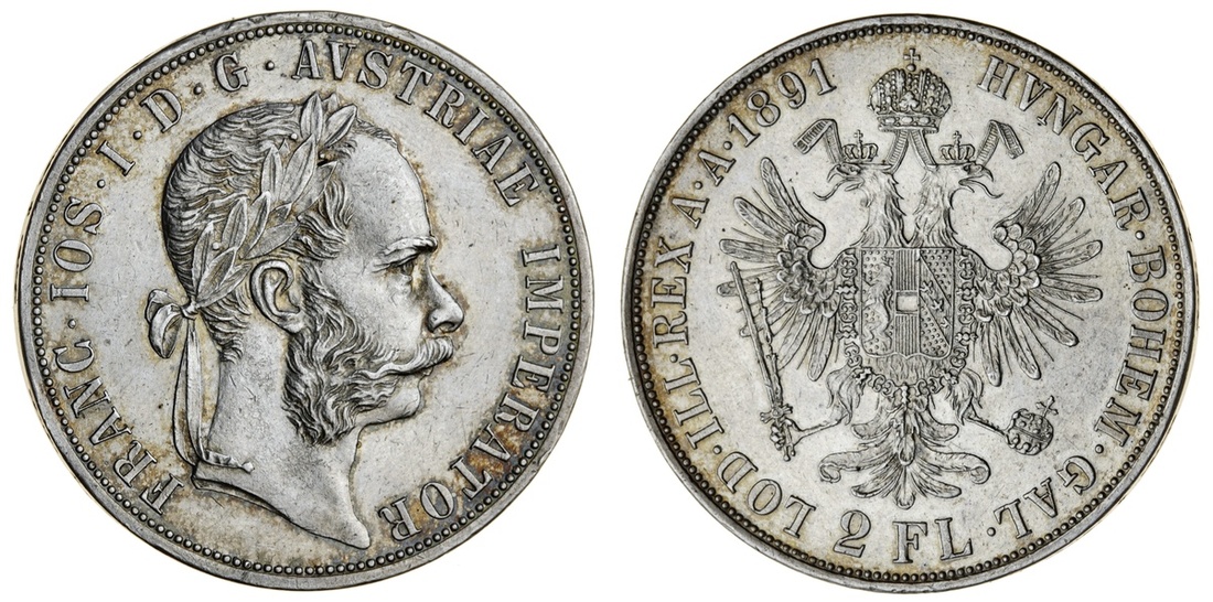 Austro-Hungarian Empire (1867-1918), Franz Joseph I, 2-Florin, 1891-A, Vienna (Fruhwald 1390; Jäger 343; KM 2233), once lightly wiped, otherwise almost extremely fine