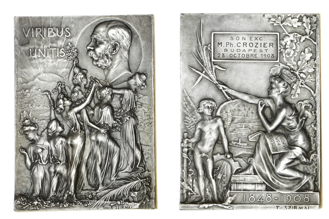Austro-Hungarian Empire, Franz Joseph I, Commemoration AR Plaque, 1908, by Szirmai, Diamond Jubilee of Franz Joseph, 1908, engraved SON EXC M. Ph. CROZIER | BUDAPEST | 28 OCTOBRE 1908, extremely fine