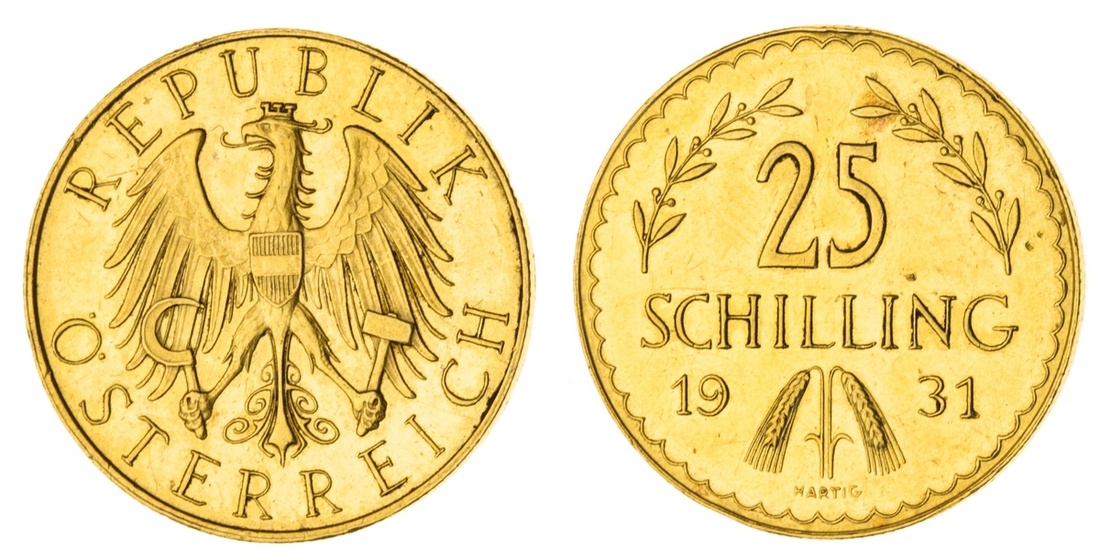 (g) Austria, Republic, gold 25-Schilling, 1931, Vienna, by Martig (Fb 521; KM 284.1), edge bump to reverse 12 o'clock, otherwise about extremely fine