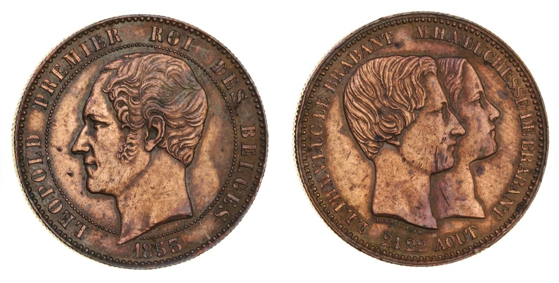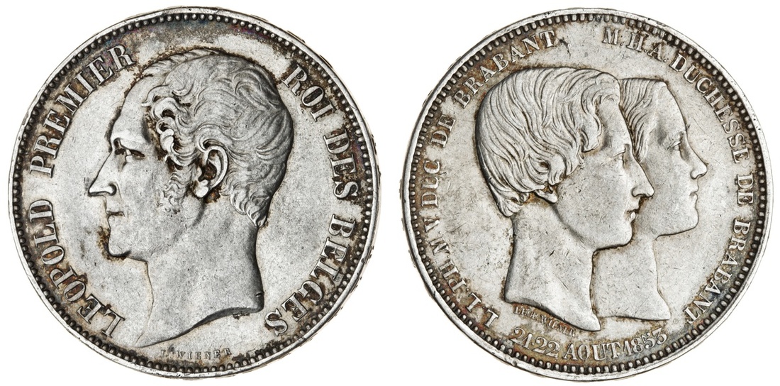 Belgium, Leopold I (1831-65), Commemorative 5-Francs, 1853, Marriage of the Duke of Brabant (Dav. 52; KM XM2.1), light peripheral tone, good very fine; additionally, 10-Centimes, similar (KM X1.1), cleaned, very fine [2]
