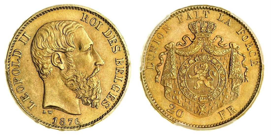 (g) Belgium, Leopold II (1865-1909), gold 20-Francs, 1876 (NBFB, no. 216; Fb 312; KM 37), choice mint state, in PCGS holder, graded MS66