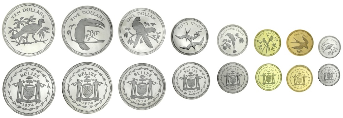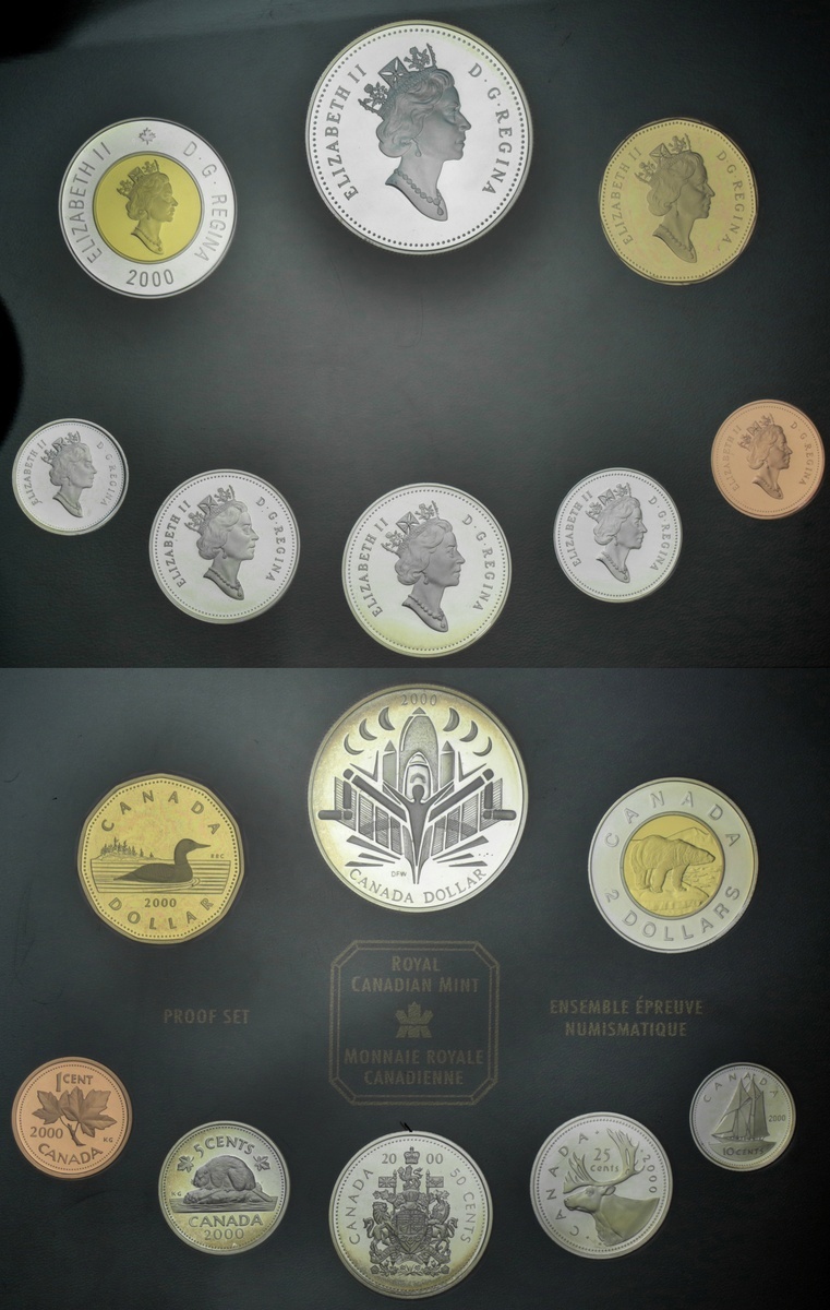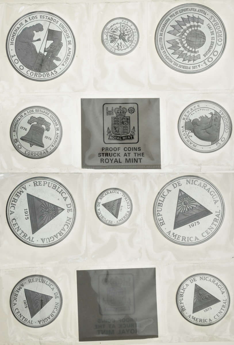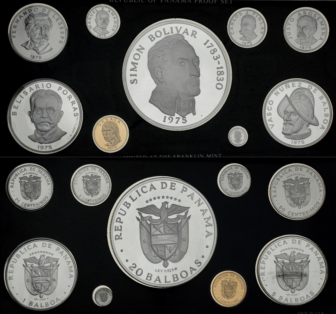 North, Central and Southern Americas, Modern Proof Sets, [5], including, Belize [2], 8-Coin set, 1974, 10-Dollars to Cent, in usual currency metal; another, 1979, set at last, but struck in .925 silver; also, Canada, Elizabeth II, 8-Coin set, 2000, 2-Dollar to Cent; Nicaragua, 5-Coin set, 1975, 100 to 25 Cordubas, in .925 silver, by Royal Mint; Panama, 9-Coin set, 1975, 20 Balboas to Centesimo, in .925 silver (KM PS.15; additionally, Currency strike, 20-Balboas, 1974, 'the largest circulating coin in the world (KM 29), all brilliant uncirculated, vacu-sealed in Franklin mint cases of issue [5 sets + 1 coin]