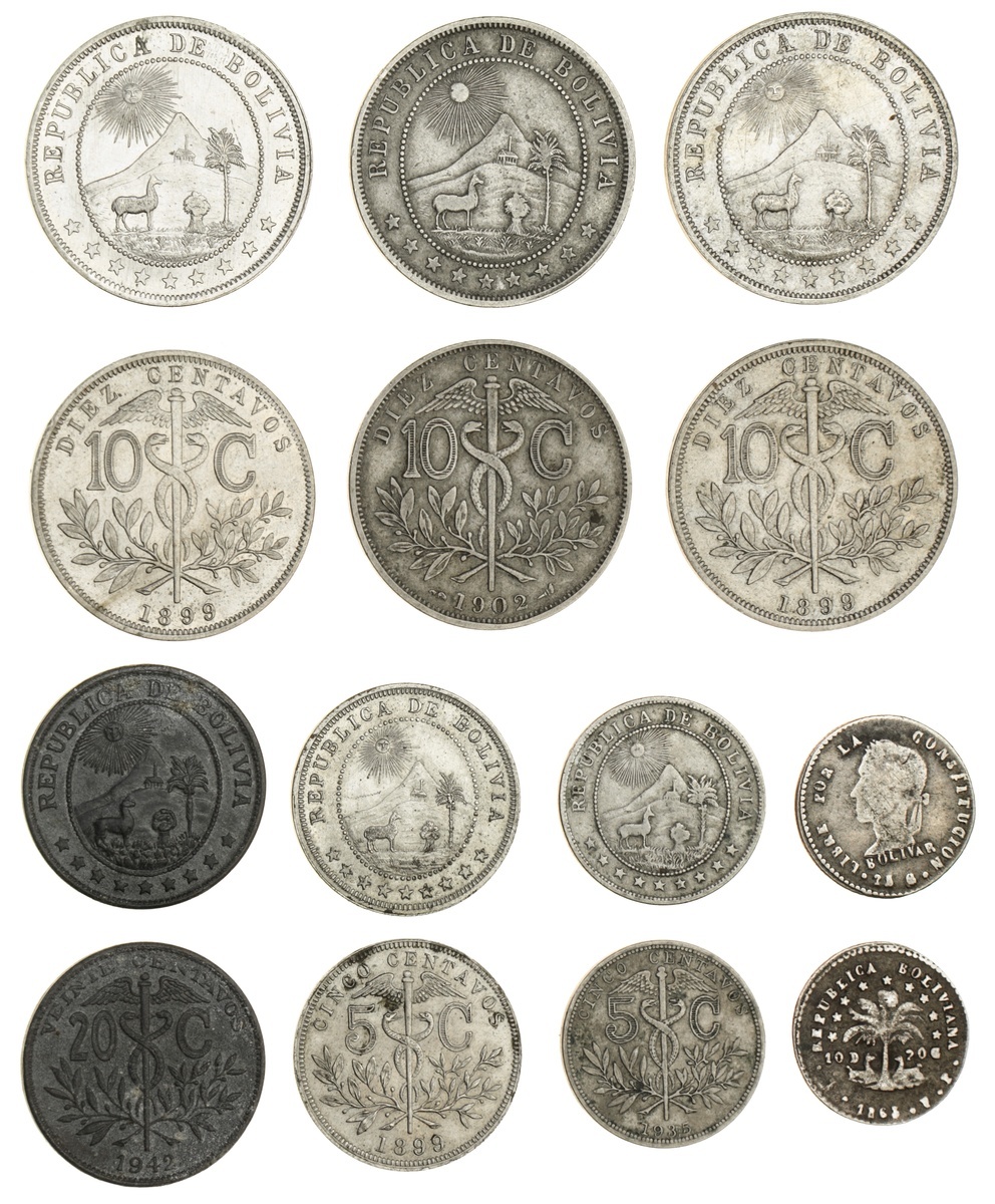 Bolivia, Half-Sol, 1863 (KM 133.2); 20-Centavos, 1942 (KM 183); 10-Centavos (3), 1899 [2]; another 1902 (KM 174.1); 174.3), 5-Centavos (2), 1899; 1935 (KM 173.1; 178), first fine, others very fine to extremely fine (7)