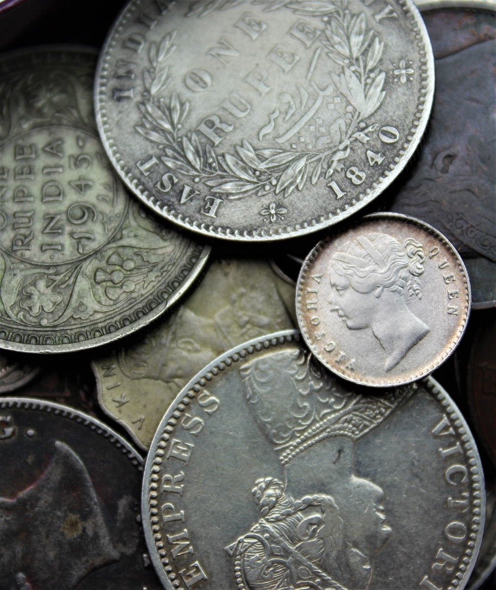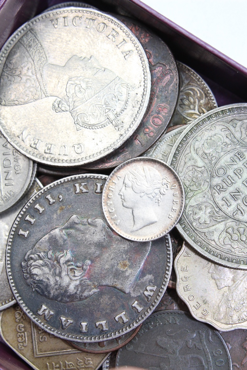 (British) East India Company [23], Rupees (5), 1835 [2] 1840 [3], 'Mohur' head {2}; another, 'Rupee' head (KM 450, 457); Quarter-Rupee, 1840 (KM 454); also, 2-Annas, 1841 (KM 460), choice mint state; Cash coins [5], XX-Cash, 1803 [2]; X-Cash, 1803; lastly, V-Cash, 1803 (2); additionally, Half-Annas (2), 1835; 1845 (KM 447.1); Quarter-Annas (6), 1830; 1833; 1835 [3]; 1838 (KM 231.1, 232, 446.1, 463.1); Twelfth-Anna, 1835 (KM 445); lastly, Cents, 1845 [2], fine to very fine or better amongst the silver issues; additionally, British India [36], including, Rupees [11], 1862; 1879; 1890; 1891; 1893; 1901; 1906; 1918; 1942; 1943; 1947 (KM 492); Half-Rupees [5], 1906; 1928; 1944; 1946; 1947 (KM 507, 522, 552, 553); Quarter-Rupees [3], 1883; 1944; 1947 (KM 490, 547, 548); 2-Annas (4), 1885; 1919; 1944; 1946 (KM 516, 541a, 542); Annas (4), 1912; 1944; 1947; (KM 513, 537a, 538); another, an unstruck scalloped planchet; also, Half-Annas [2], 1944; 1946 (KM 534b.2; 535.2); Twelfth-Annas [2], 1888; 1929 (KM 488, 509); lastly, Pices (5), 1943 [2];1944; 1945 [2] (KM 533), generally very fine and better, some cleaned [59]