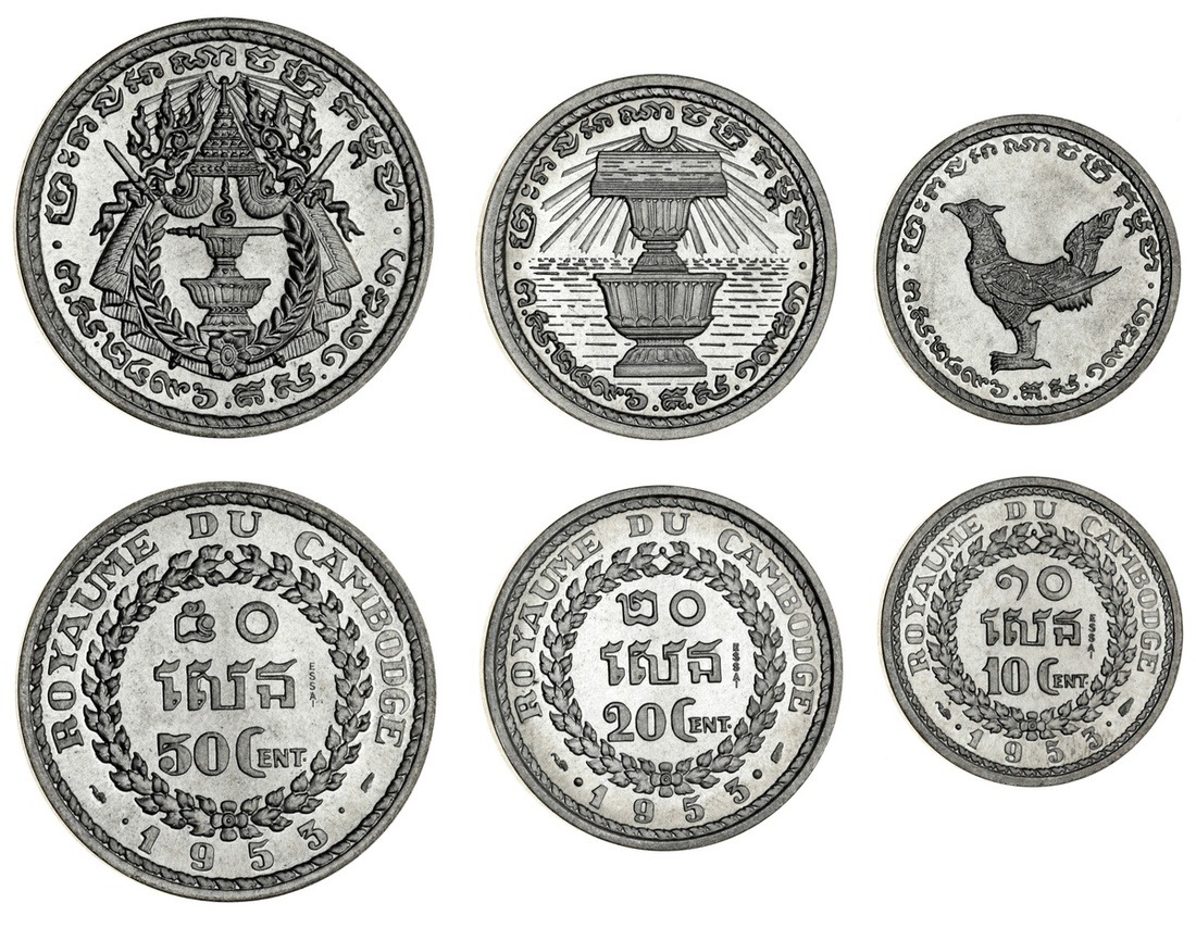 Cambodia, French Protectorate, Norodom Sihanouk, as King (1941-55), Pattern 3-Coin Set, 1953 [3], including, 50, 20 and 10 Centimes, marked ESSAI in field (Lecompte 147, 151, 154; KM E9-E11; Dan. S111a, 112a, 113a), brilliant uncirculated, very rare, only 104 sets struck, in fitted holder of issue [3]