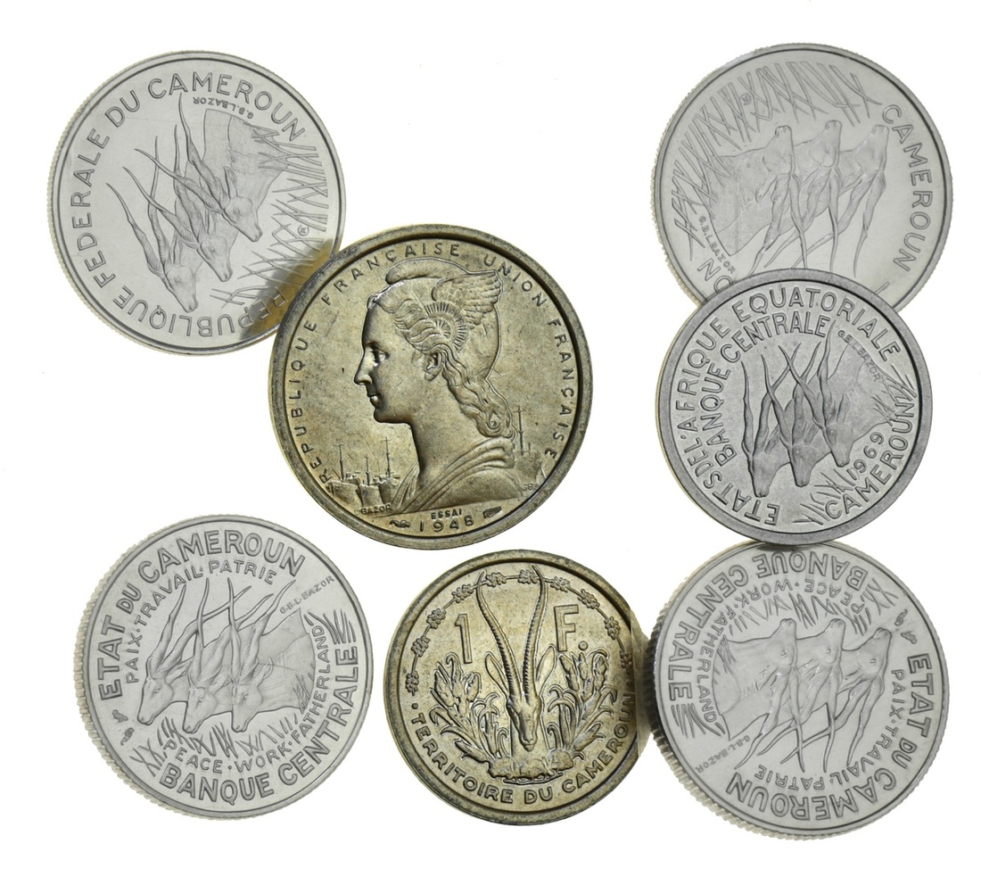 Cameroon, French Territorial Mandate, Essais [2], Pattern 2-Franc, 1948 (KM E5); another, Pattern Franc, 1948 (KM E6); together with: French Equatorial Africa, Essais [5], Pattern 100-Francs, in nickel [4], 1966 [2] (KM E11); also, 1971, reduced weight (KM E13); again, 1971 [2]; also, Pattern Franc, 1969, Banque Centrale, ESSAI in reverse field (KM -), all uncirculated or brilliantly so, some in vacupacks of issue [7]