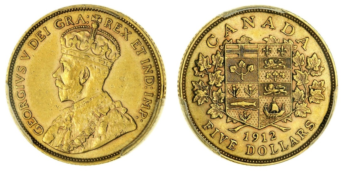 (g) Canada, George V (1910-36), gold Five-Dollars, 1912, Ottawa (Fb 4; KM 26), in PCGS holder, graded AU55