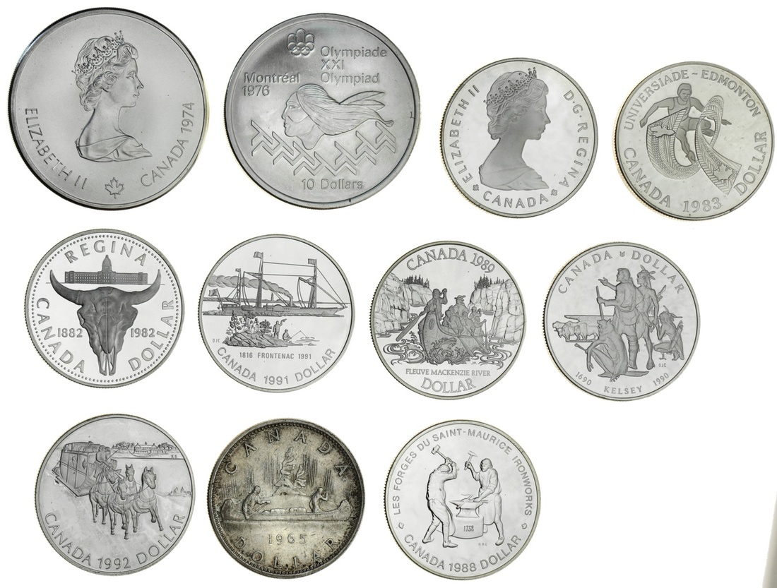 Canada, Elizabeth II (1952-), silver Commemorative coins, 10 Dollars, 1976 Montreal Olympics (2) (KM 93; KM 102); Proof Dollar (8), 1991, S.S. Frontenac (KM 179); 1990, Henry Kelsey (KM 170); 1982, Regina (KM 133); 1983, Edmonton University Games (KM 138); 1989, MacKenzie River (KM 168); 1985, National Parks (KM 143); 1988, Ironworks (KM 161); 1992, stagecoach service (KM 210); and Dollar, 1965 (KM 64.1), the last toned, very fine, the rest extremely fine or better (11)