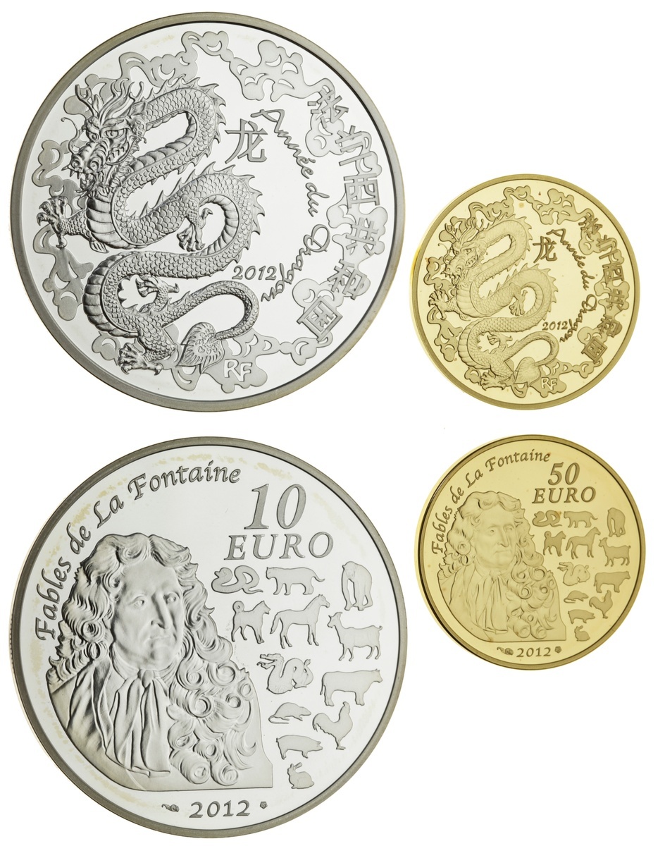 (g) Chinese Year of the Dragon, 2012, Monnaie de Paris [2], gold Proof 50-Euros, .920 AV, 8.45g, brilliant uncirculated, 1,000 examples struck, in fitted case of issue, with certificate of authenticity no. 0315; additionally, silver Proof 10-Euros, .900, 22.2g, equally brilliant, in fitted case of issue with certificate of authenticity no. 01165 [2]