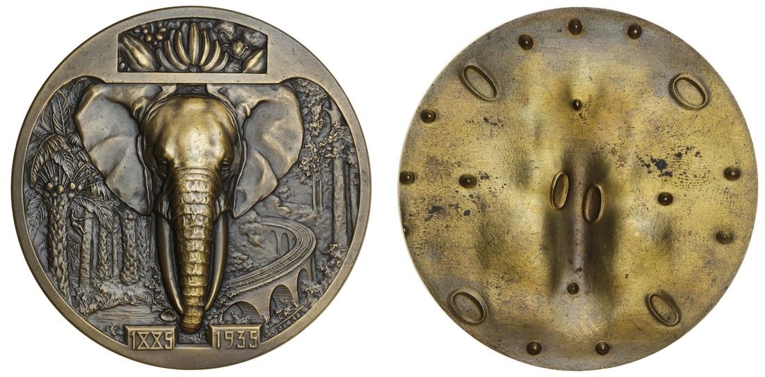 "Hommage aux créateurs des Congo, Belge et Français", 1935, a uniface 'Artist's' Proof' AE Medal, by E.H. Becker, head of elephant above railway viaduct, forest in background, 69mm., good very fine