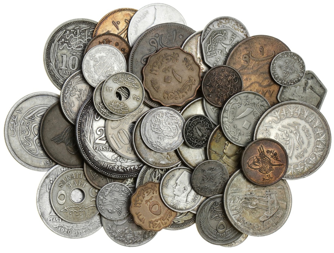 Egypt, mixed coins (28), includes: Farouk (AH 1355-72 / 1936-52) [8], 10-Piastres, AH 1356 (KM 367); 5 Piastres (3), AH1356; AH 1358 (KM 366); 2-Piastres (2), AH 1356; another, AH 1393 (KM 365, 369); 10-Milliemes, AH 1362 (KM 361); 5-Milliemes, AH1362 (KM 360); additionally, Hussein Kamil [12], 25-Piastres, AH 1384 (KM 406); 20-Piastres, AH 1335 (KM 321); 10-Piastres (3), AH 1335 (KM 319, 327); 5-Piastres (2), AH 1335 (KM 318.1); 2-Piastres, AH 1335 (KM 317); 10-Milliemes, AH 1335 (KM 316); 5-Milliemes, AH1335 (KM 315); Millieme [2], AH 1335 (KM 313); additionally, First Republic, 5-Piastres, AH 1376 (KM 382); and, United Arab Republic, 5-Piastres, AH 1380 (KM 397), Fuad I [6], 10 Piastres (2), AH 1341 (KM 337); 5-Piastres (2), AH 1341; AH 1348 (KM 336, 349), 10-Milliemes, AH 1342 (KM 334); 2.5 Milliemes, AH 1352 (KM 356); additionally, Ottoman Empire [17], including: Abdul Mejid [4], 5-Para, AH 1255 (KM 223), 10-Para, AH 1277 (KM 241), 20-Para, AH 1277 (KM 244), 40-Para, AH1277 (KM 248.1); Murad V, 1/40-Qirsh, AH 1293 (KM 287); Abdul Hamid II [6], 1/20-Qirsh [2], AH 1293 (KM 288); also, 1/10-Qirsh [2], AH 1293 (KM 289); Qirsh, AH 1293 (KM 292); 5-Qirsh, AH 1293 (KM 294); Muhammad V [4], Qirsh, AH 1327, (KM 305), 5/10 Qirsh, AH 1327 (KM 304), 2-Qirsh [2], AH 1327 (KM 307), all good to very fine or better, an interesting lot (44)