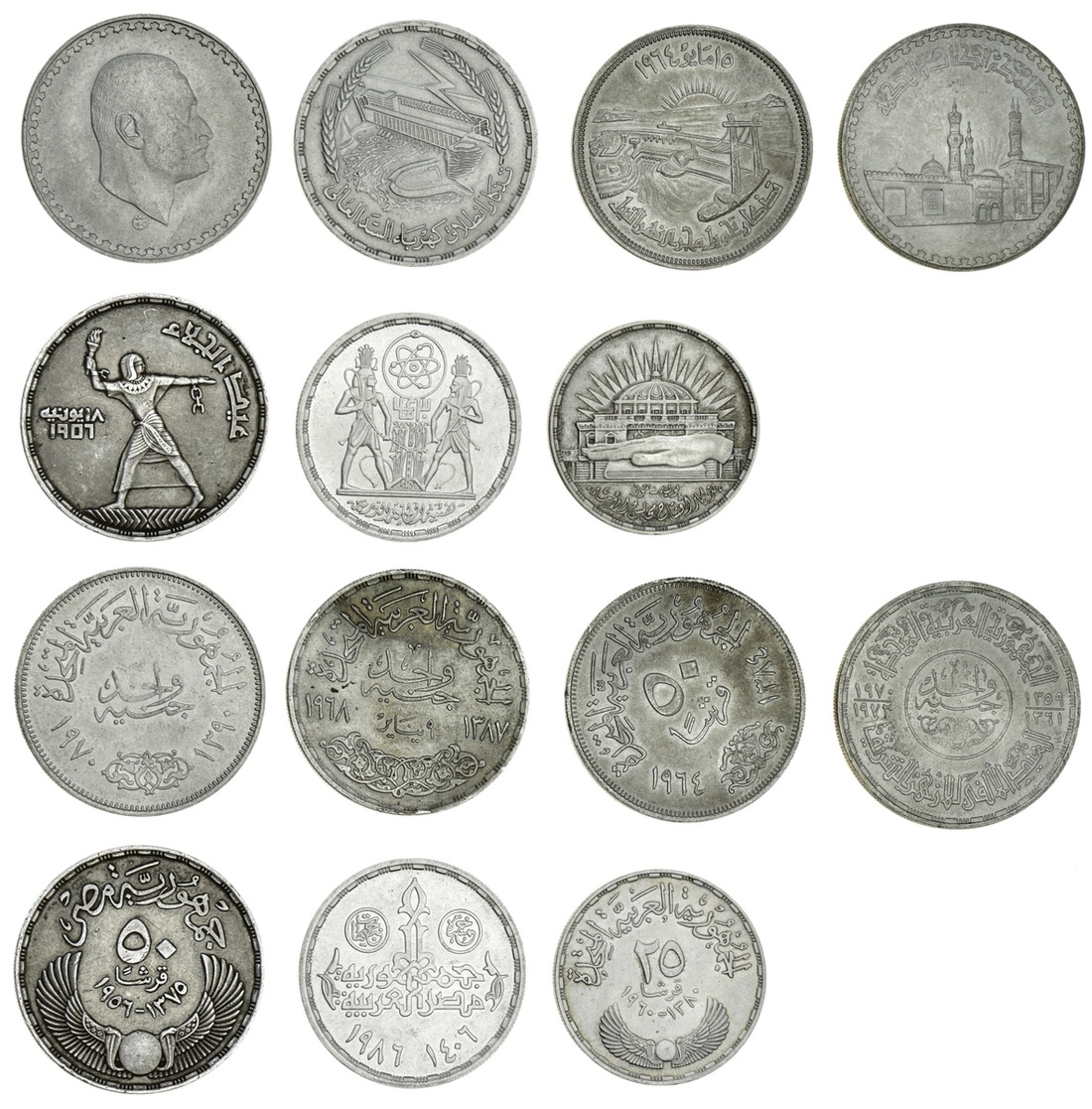 Egypt, commemorative issues [7], 50-Piastres [2], AH 1375 {1956}, Evacuation of the British (KM 386); AH 1384 {1964}, Nile River (KM 407); also, 25-Piastres [3], AH 1380 {1960} (KM 400); 1986, 30th Anniversary of Atomic Energy (KM 615); another, AH 1390 {1970} (KM 425); lastly, Piastres [2], 1968, Power Station at Aswan Dam (KM 415); another, 1970, Al Azhar Mosque (KM 424), extremely fine to uncirculated or near so [7]