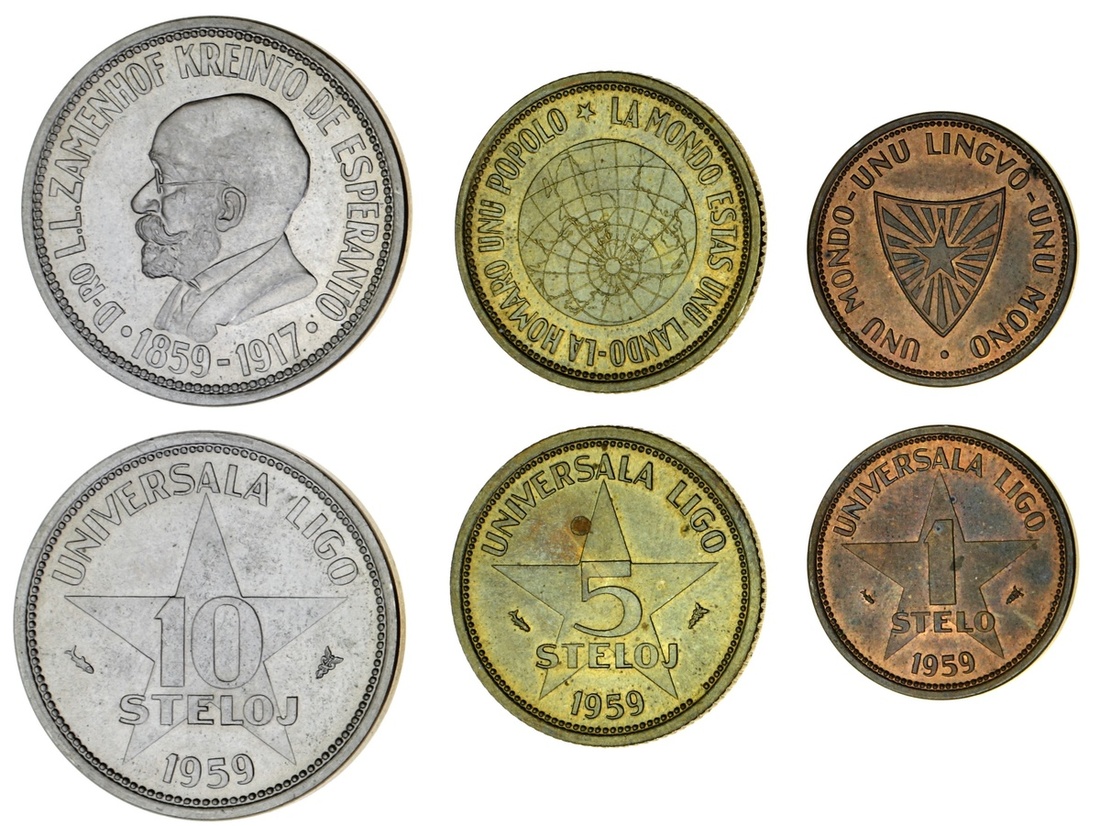 Esperanto, Universal League, Ludwik Lejzer Zamenhof (1945-93) (3), 10-Steloj, 1959, 'L.L. ZAMENHOF KREINTO DE ESPERANTO' {"Dr. Zamenhof, creator of Esperanto"}; also, 5-Steloj, 1959, 'LA MONDO ESTAS UNU LANDO LA HOMARO UNU POPOLO' {"The world is one country, humanity one people"}; Stelo, 1959, 'UNU MONDO · UNU LINGVO · UNU MONO' {"One world, one language, one currency"} brilliant uncirculated, all with a mintage of 10,000 pieces (3)