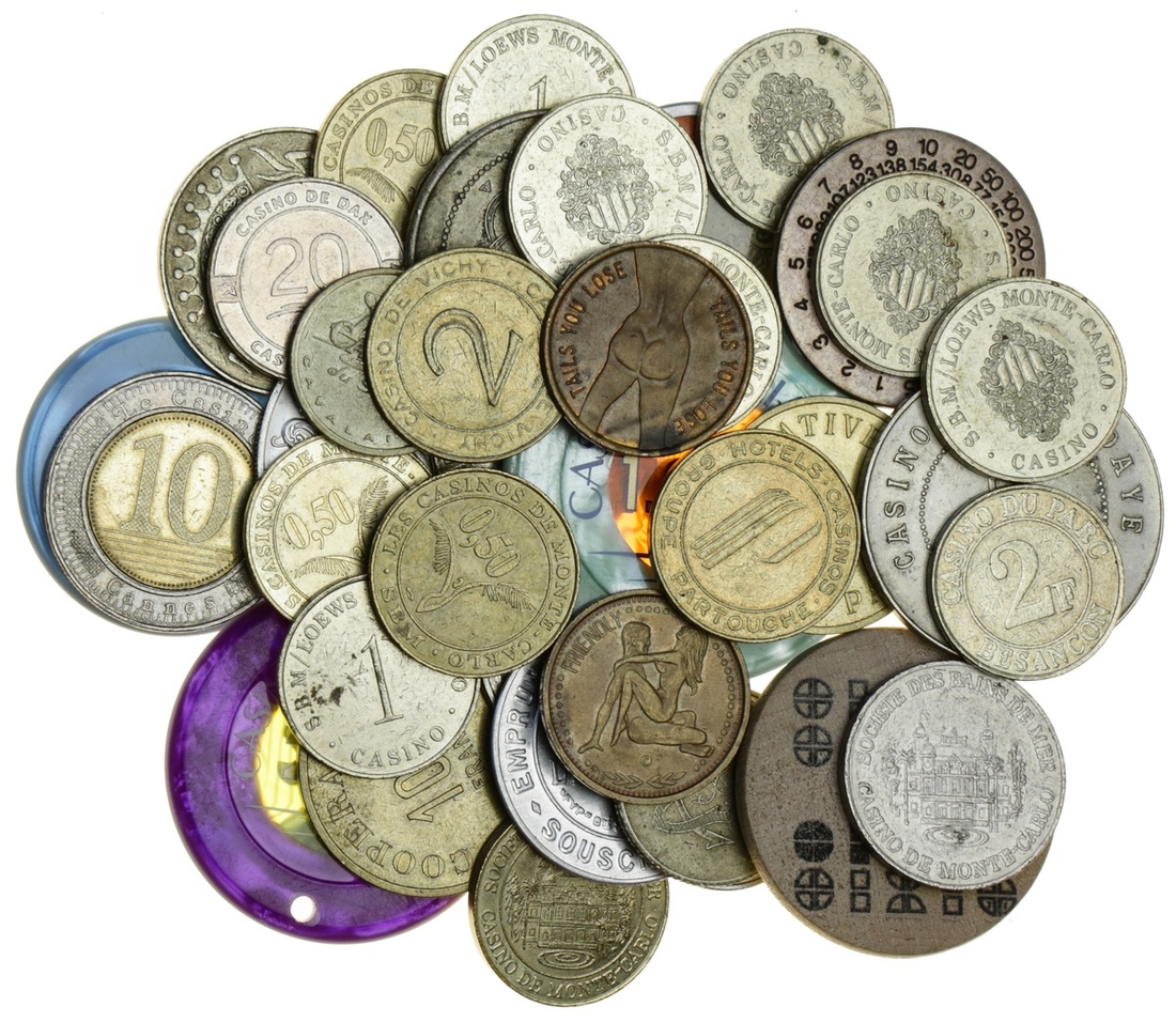 Europe, Casino Tokens and 'Stamp Money', a miscellany (38), Casino de Monte Carlo, [13] 100 Franc, 10, 0.50, 1, Casino de Biarritz, 1,000, 200, Casino Municipal, 10; Grand Casino Chamonix, 5, OIXIO Seattle/Paris 2013, 5213, Casino Cannes, 10, Casino des Pins, 50 cents, Casino de Hendaye, 5, Casino Cavalaire, 0.20, Casino de Dax, 20 cents, Earth, 25 Cents, 1994, Casino Ruhl, 10, Casino Deauvile, DE, 25F Cooperative Paris, 50 Francs, 100 Francs, Casino de Vichy, 2, Casino du Parc, 2-Francs, Norwegian Cruise Line, 25-Cents, Emergency French Stamp Money, New Caledonia, 25 Cents, Credit Lyon, 5 Cents, Erotic Token, [2] 'Connect With a Leo', and other miscellaneous token, extremely fine or better (38)