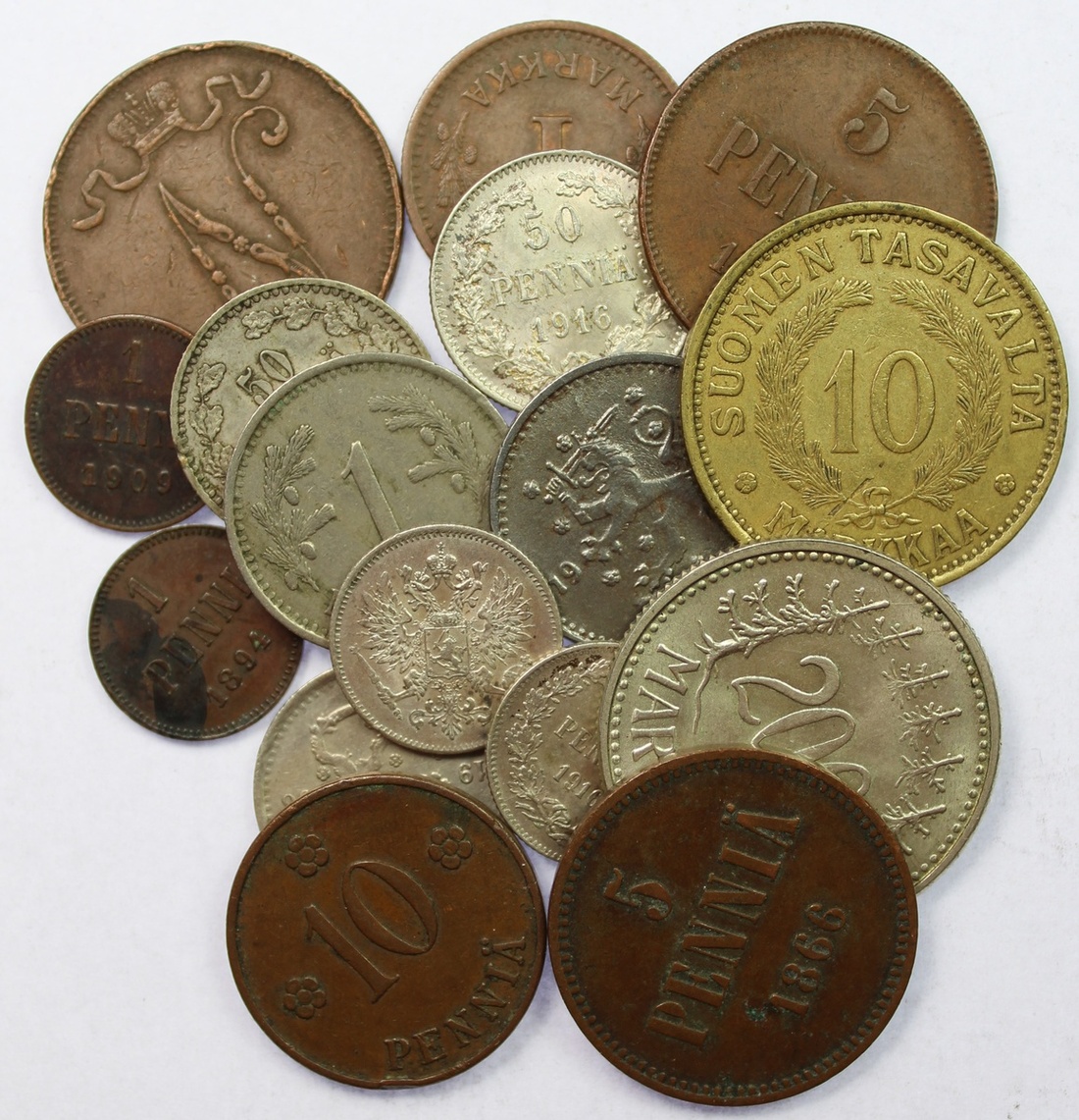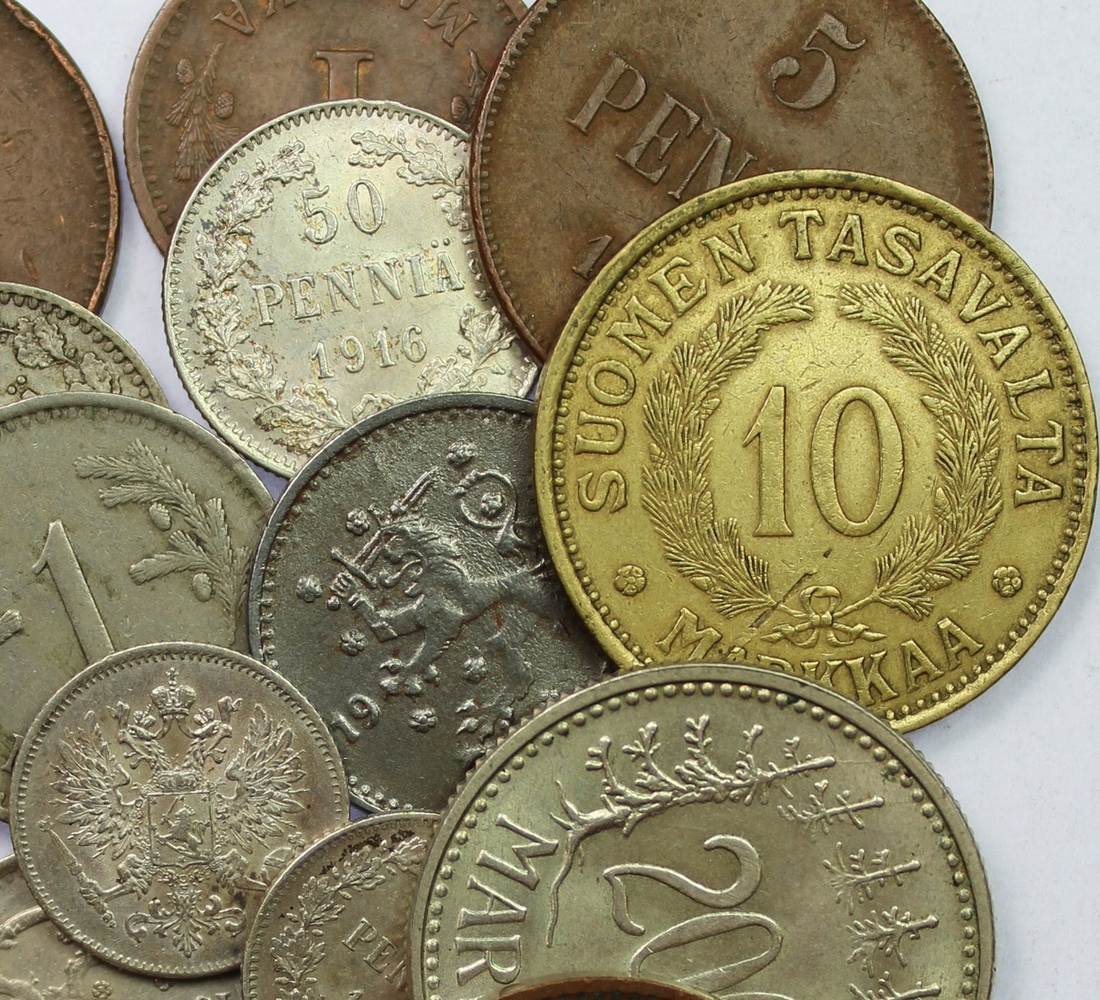 Finland (17), Penni [2], 1894; 1909; 5-Pennia [3], 1866; 1907; 1916; also, 10-Pennia, 1926; 25-Pennia [2], 1916, 50-Pennia [3]; 1865; 1916, 1936; Markka [3], 1930; 1941; 1943; 10-Markka, 1930; 200-Markka, 1957 (KM 10, 13, 4.1, 15, 24, 6.2, 2.2, 2.1, 26, 30, 30a, 30b, 32a, 42), very fine to extremely fine; additionally, Finland, 100-Markkaa, 1989, 'Pictorial Arts of Finland' (KM 75), uncirculated (17)