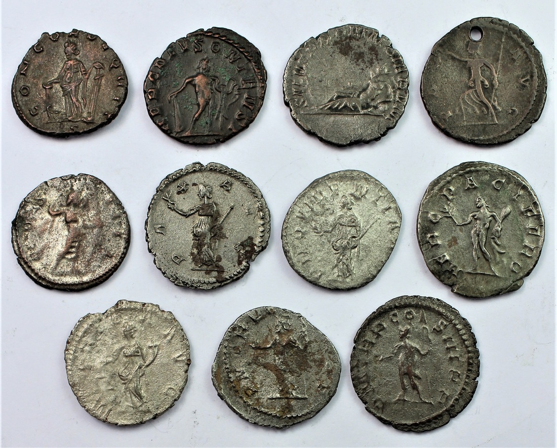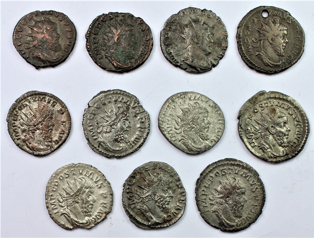 Gallic Empire, Postumus (c. AD 259/60-268), AR and BI Antoninianii, Treveri [11], including, P M TR P COS III P P, Mars standing left {2}, 2.51g; another, 2.62g (Cohen 244); 3.37g, CONCORDIA AEQVIT, S in exergue (BMC 66, 149); 3.44Gg, HERC DEVS ONIENSI (Cohen 91; RIC 64; Cunetio 2383); 2.98g, SALVS PROVINCIARVM (Cohen 355); 3.53g, PAX AVG [2]; another, 3.30g (Cohen 215, 220), pierced; also, 2.89g, COS IIII (Cohen 144); 3.03g, PROVIDENTIA AVG (Cohen 295); 3.43g, HERC PACIFERO (Cohen 101); lastly, 2.79g, MONETA AVG, generally good fine to good very fine [11]