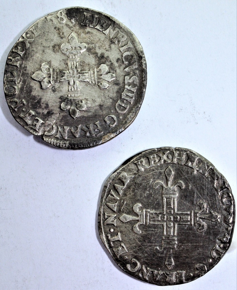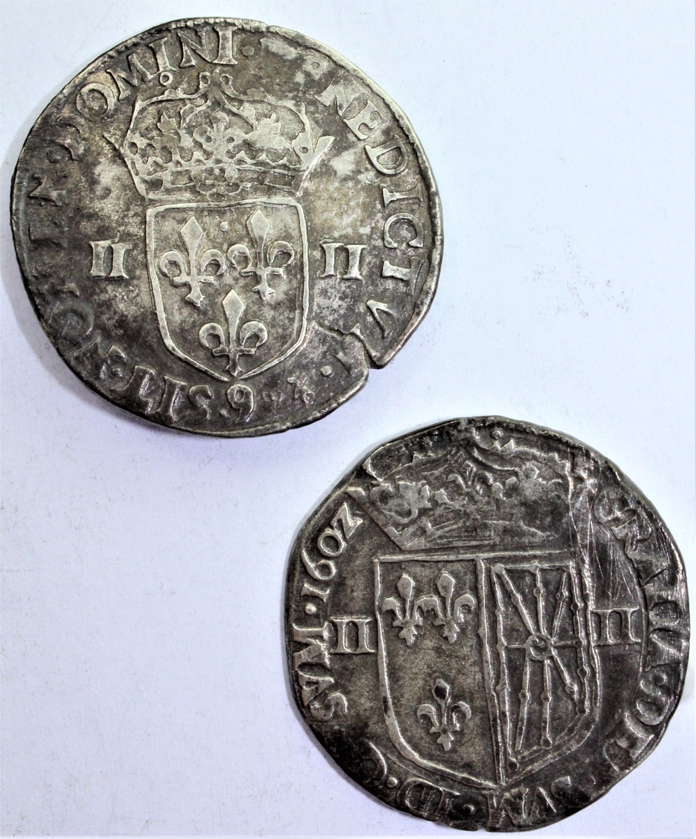 France, Kingdom {Valois-Orléans} Henri III (1574-89), Quart d'écu, 1578-9, Rennes (Duplessy 1133; Ciani 1438), striking crack, otherwise fine; another, {Bourbon}, Henri IV, le Grand (1589-1610), Quart d'écu de Navarre, 1602 {in Z form} - P, Saint-Palais (Duplessy 1238), once cleaned, otherwise good fine, scarce [2]