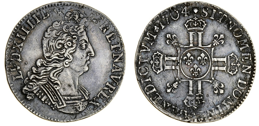 France, Kingdom {Bourbon}, Louis XIV, 'le roi soleil' (1643-1715), Demi-Écu aux huit-L, 1704-[A ?] Paris [?] (Duplessy 1552a; Droulers 439; Gad 194; Ciani 1925), traces of undertype visible at periphery resulting in some striking weakness, otherwise toned, approaching very fine