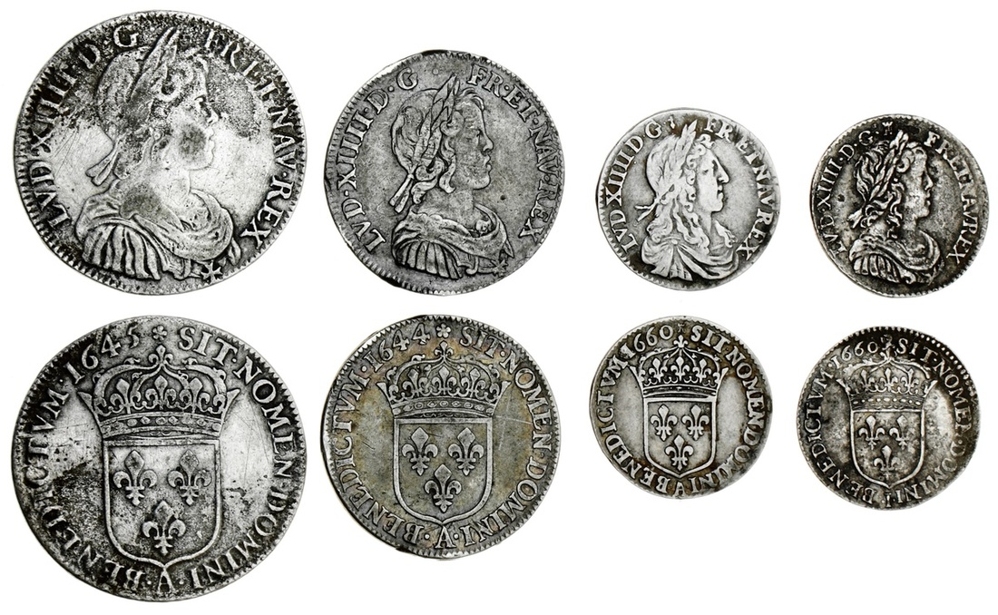 France, Kingdom {Bourbon}, Louis XIV, 'le roi soleil' (1643-1715), Demi-Écu de Warin {à la méche courte}, 1645-A, Paris (Droulers 474); Quarter-Écu de Warin {à la méche courte}, 1644-A (Droulers 594); also, 1/12-Écu [2], {à la méche longue}, 1660-I, Limoges (Droulers 644); another, {buste juvénile}, 1660-A, Paris (Droulers 651A), all fine or marginally better, the first once wiped [4]