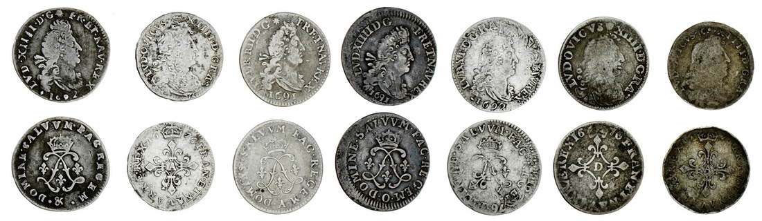 France, Kingdom {Bourbon}, Louis XIV, 'le roi soleil' (1643-1715), 4-Sols [6], 'des traitants' type, [3], 1676-A, Paris [2]; another, 1676-D, Lyon (Duplessy 1504; Gad 103; Droulers 675A; B); also, 'aux deux-L couronnés' [4], 1691-A, Paris; 1691-O, Riom; 1692-[?], struck over 'des traitants' issue of 1676; lastly, 1692-&, Aix (Duplessy 1519; Gad 106; Droulers 677), generally fine, some lightly cleaned [7]