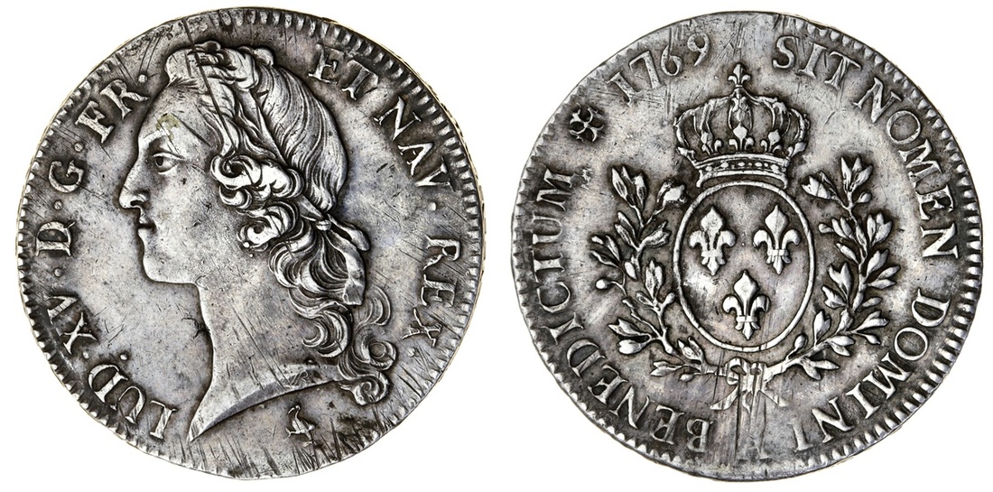 France, Kingdom {Bourbon}, Louis XV, 'le Bien-Aimé' (1715-74), Écu 'au bandeau', 1769-A, Paris, bird below truncation (Duplessy 1680; Dav. 1331; Gad 322; KM 512), adjustment marks with light tone, possibly once wiped, otherwise almost very fine