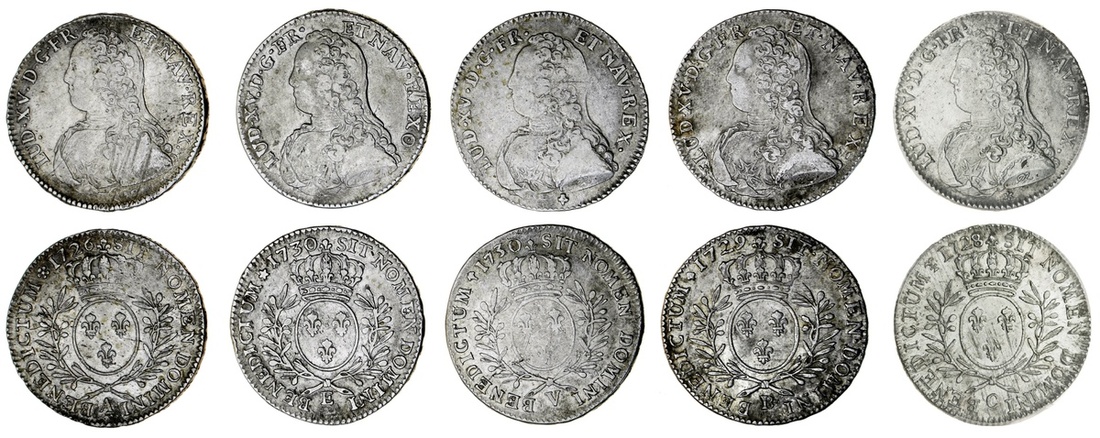 France, Kingdom {Bourbon}, Louis XV, 'le Bien-Aimé' (1715-74), Demi-Écu 'aux lauriers / branches d'olivier' [5], 1726-A, Paris; another, 1728 over 6-C, Caen; another, 1729-B, Rouen; 1730-E, Tours; lastly, 1730-V, Troyes (Duplessy 1675; Dav. 1330; Droulers 755; Gad 313; KM 486.1, 3, 6), all lightly cleaned, otherwise generally very fine except last, the second in PCGS details holder, graded [5]