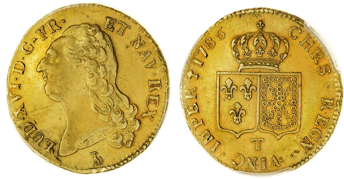 France, Kingdom {Bourbon}, Louis XVI (1774-93), Double Louis d'Or, 1786-T, Nantes, first semester, no dot, young head left,
