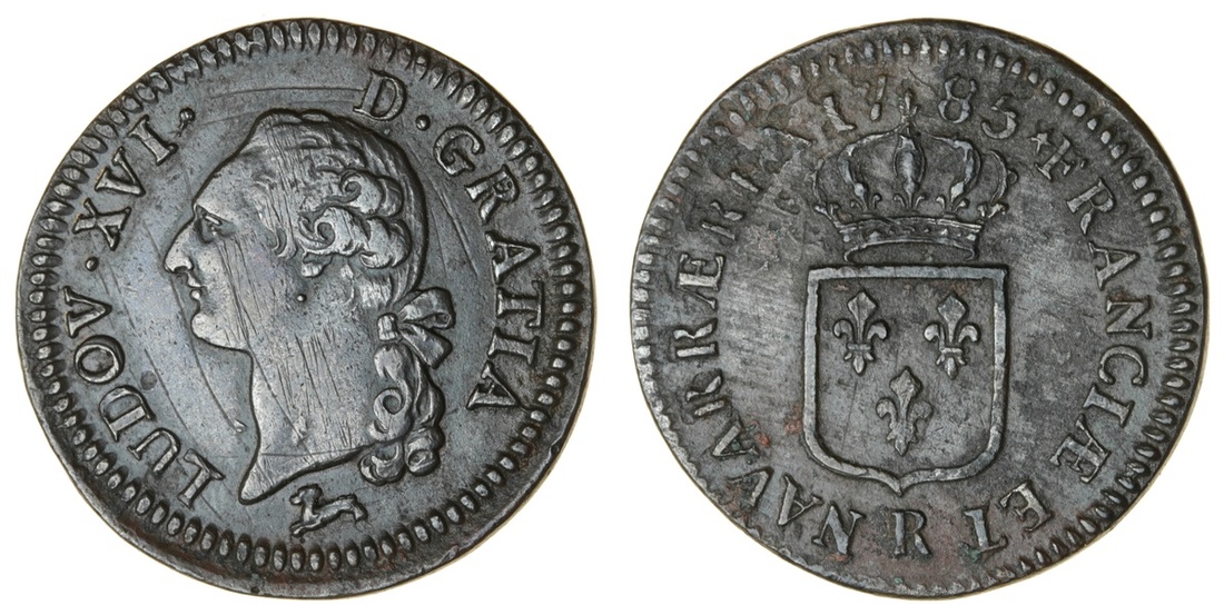 France, Kingdom {Bourbon}, Louis XVI (1774-93), Sol à l'écu, 1785-R, Orléans (Duplessy 1714; Gad 350; KM 578.14), surface grooves and pitting resultant from cleaning in antiquity, otherwise very fine, very rare with a mintage of 72,545 pieces