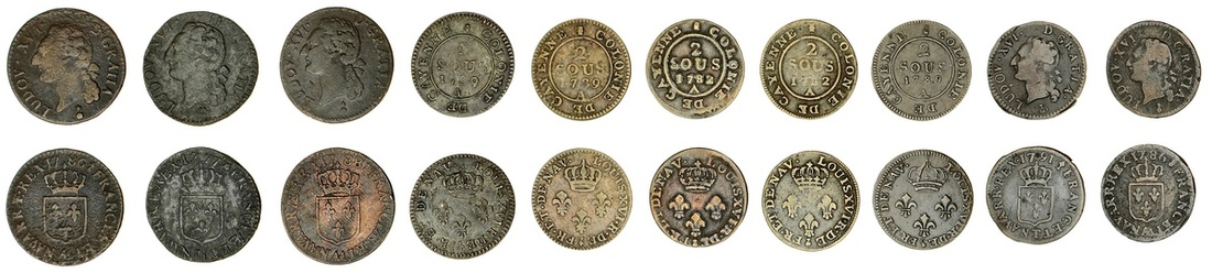 France, Kingdom {Bourbon}, Louis XVI (1774-93), Demi-Sols à l'écu [3], 1777-N, Montpellier; others, Metz [2], 1786-AA; another, 1788-AA (Droulers 819; Duplessy 1710; Gad 349), fair to fine; also, Liards à l’écu [2], 1786-W, Lille; 1791-T, Nantes (Droulers 822; Duplessy 1711; Gad 348); also, 3-Sous de Bourbon, 1781-A; 1791-A, Paris; and 2-Sous de Cayennes [6], 1782-A, Paris [3]; also, 1789-A, Paris [3] (Lecompte 13; Duplessy 1712; Ciani 2215; Gad 3), some lightly cleaned, otherwise fine to very fine, all scarce [12]