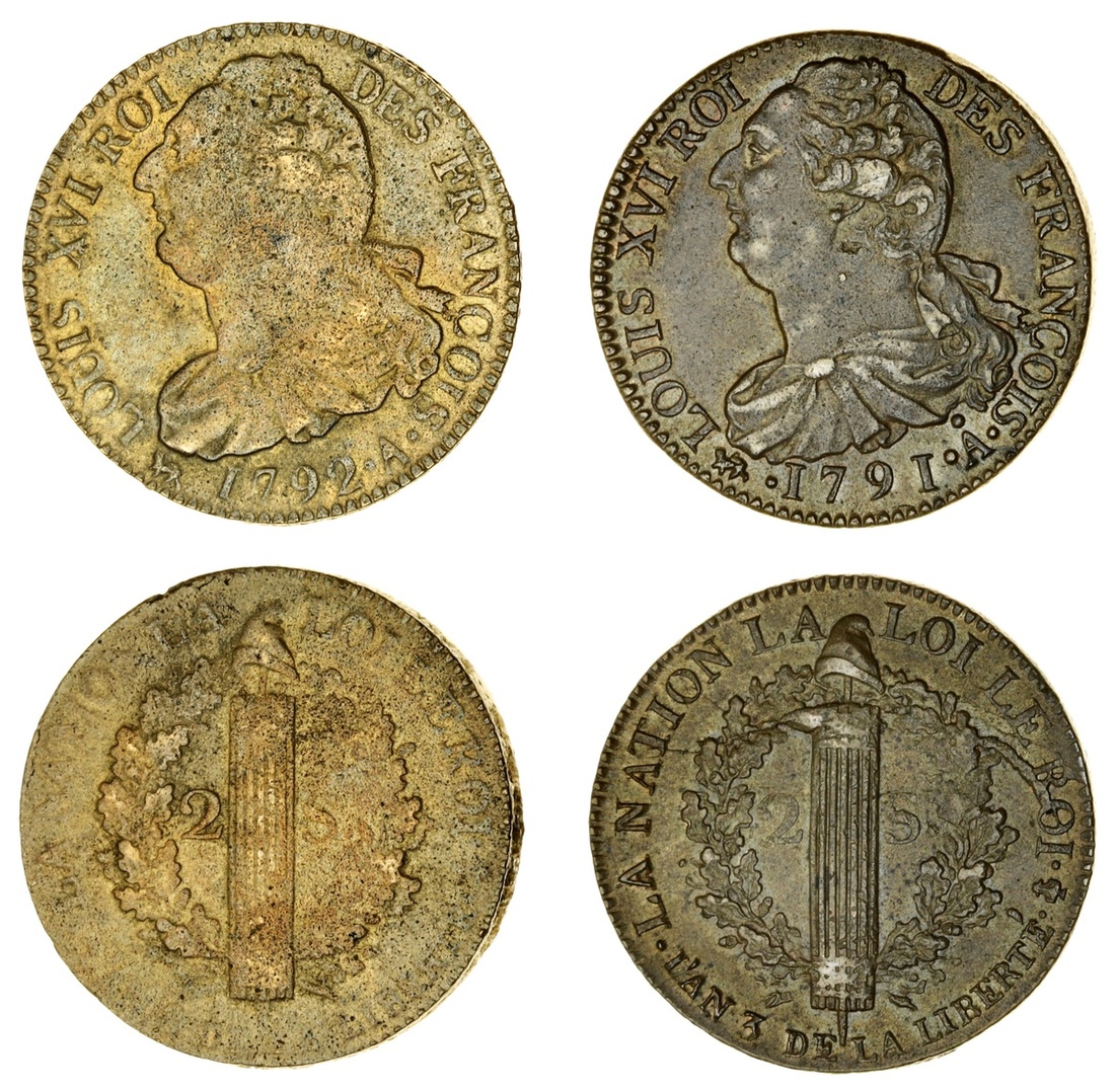 France, Kingdom {Bourbon}, Louis XVI (1774-93), Constitutional 2-Sols, Paris [2], 1791-A, [AN 3]; 1792-A [AN 4] (Duplessy 1722; Ciani 2249; Gad 25; KM 603.1), the first with a dark patina, the second lustrous, both good very or better and much as struck for issue [2]