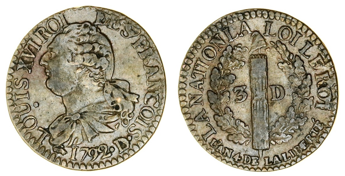 France, Kingdom {Bourbon}, Louis XVI (1774-93), Constitutional 3-Deniers {Liard}, 1792-D [AN 4], Lyon (Droulers 909; Duplessy 1725; Ciani 2256; Gad 5), chocolate patina, near very fine, rare
