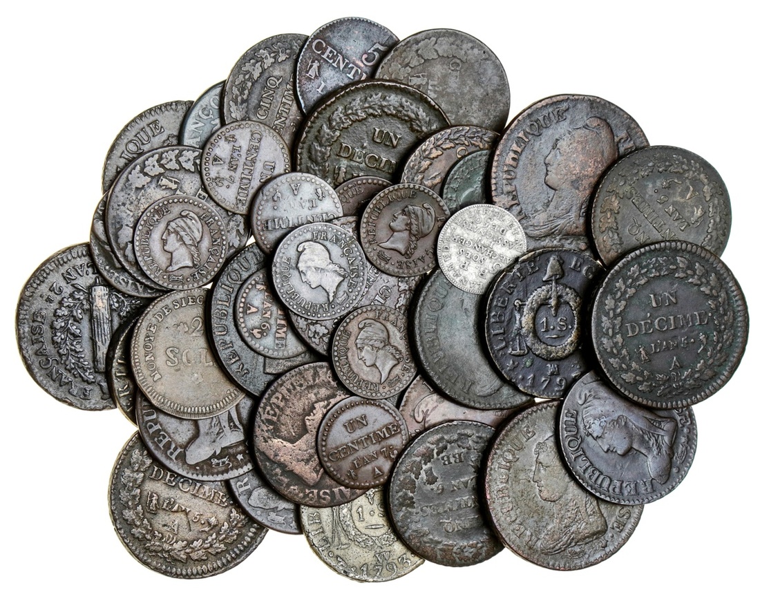 France, First Republic, Convention Nationale (1792-95), Siege of Mainz [2], 5-Sols, 1793-A [AN 2}, also, 2-Sols, 1793-A {AN 2} (Droulers 71); also, 2-Sols aux balances, 1793-AA, Metz (Gad 19; KM 621), with scratches in field, otherwise fine; also, Décimes [8], including, Paris [5], 'AN 4'-A, 'UN' engraved above DECIME' later; AN 5-A [2]; AN 7-A [2], one latterly silvered; also, Rouen, AN 5-B; Strasbourg: AN 7-BB; Bordeaux, AN 8-K; also, Sols aux balances, 1793 {AN II} (5), including: Lyon, 1793-D; Limoges, 1793-I; Marseille, 1793-MA; Nantes, 1793-T; lastly, Lille, 1793-W (KM 619); also, 5-Centimes (14), including, Paris [4 {?}], AN 4-A [2]; AN 5-A; AN 8[-A {?}]; Metz, AN 8-AA; Strasbourg [5], AN 6 over 5-BB; AN 7-BB; AN 8-BB; another, AN 8 over 6-BB; AN 9-BB; Lyon, AN 7 over 5-D; Bordeaux [2], AN 6-K; and, AN 7-K; lastly, Lille, AN 8-W (Le Franc 113, 115); Centimes, Paris (10), including, AN 6-A [4]; AN 7-A [4]; AN 8-A [2] (Gad 76); generally fine or near so, some once cleaned (40)