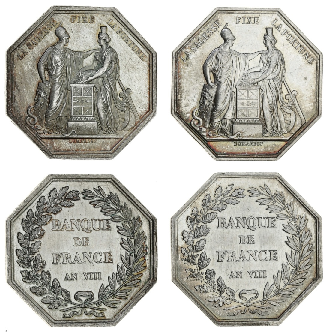 France, First Republic (1789-1804), AR octagonal Jettons, Bank of France, 1800, 36.5mm. [2]; 22.80g; another, 22.27g, a light cabinet tone overlying brilliance on latter, the first mint lustrous, both much as struck, attractive thus [2]