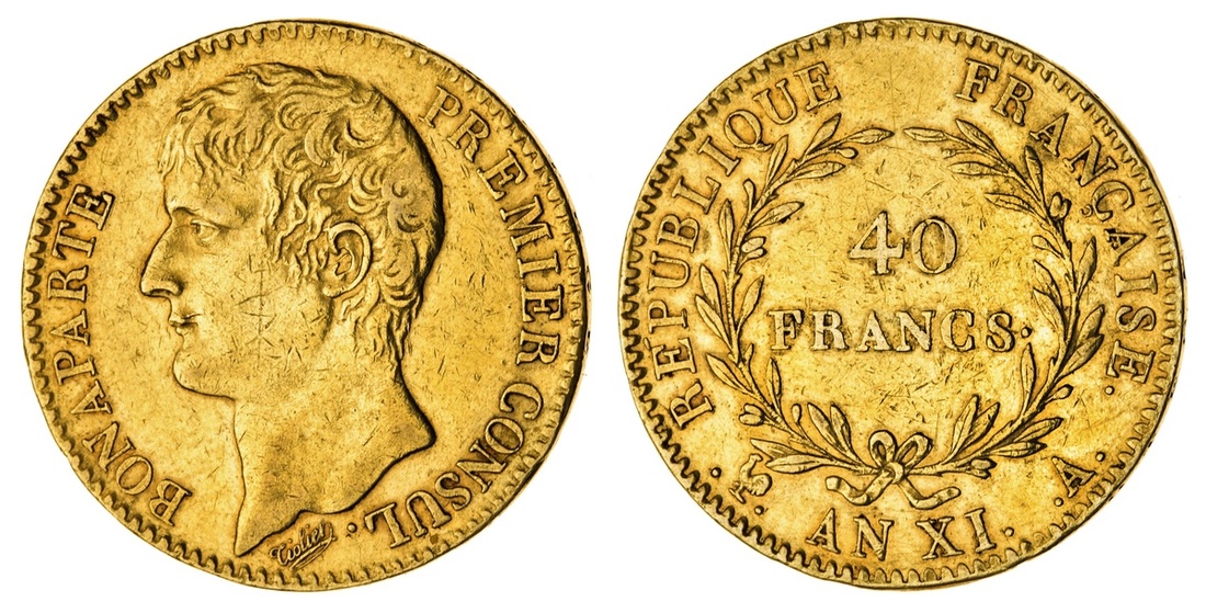 (g) France, First Republic, Consulship, Napoléon Bonaparte (1799-1804), gold 40-Francs, AN XI-A {1803}, Paris (Fb 536), light wipe, about very fine