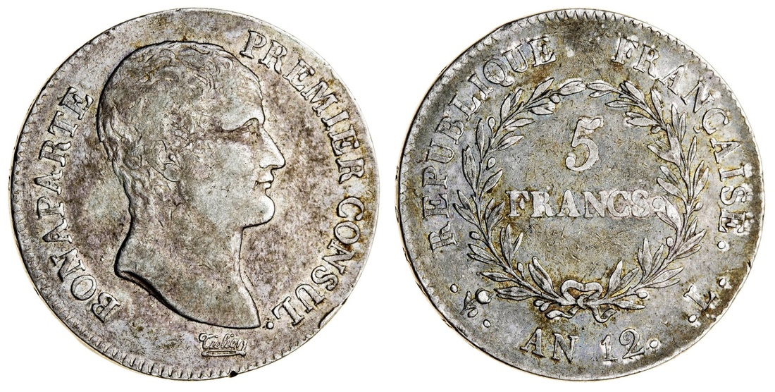 France, First Republic, Consulship, Napoléon Bonaparte (1799-1804), 5-Francs, AN 12-L {1803-04}, Bayonne {tulip} (Le Franc 301; Gad 577), toned with some underlying lustre, good fine