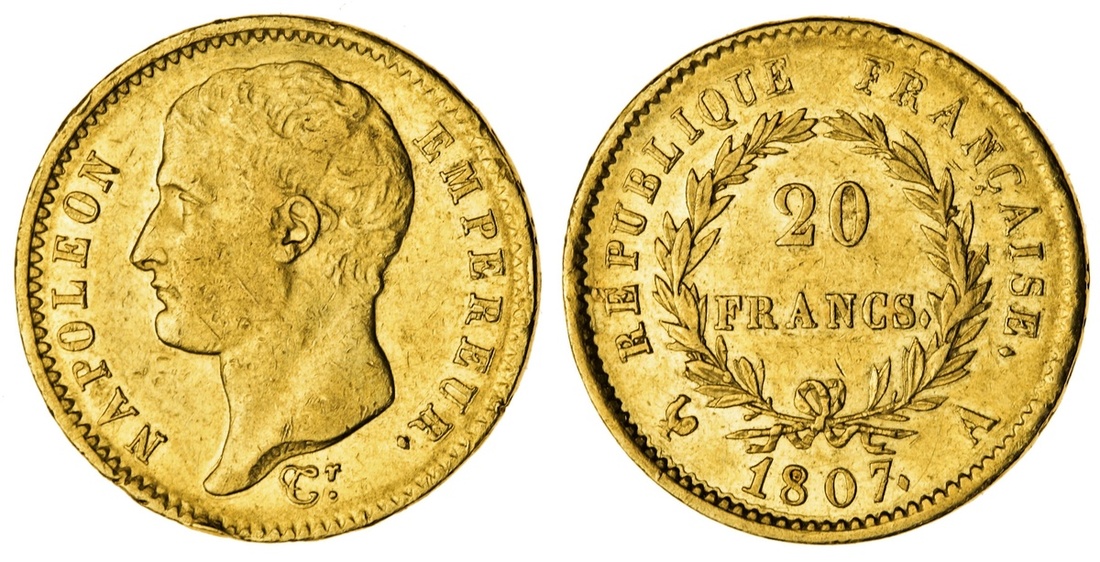 (g) France, First Empire, Napoléon Bonaparte (1804-14), gold 20-Francs, 1807-A, transitional type (Le Franc 514; Gad 1023a), about very fine