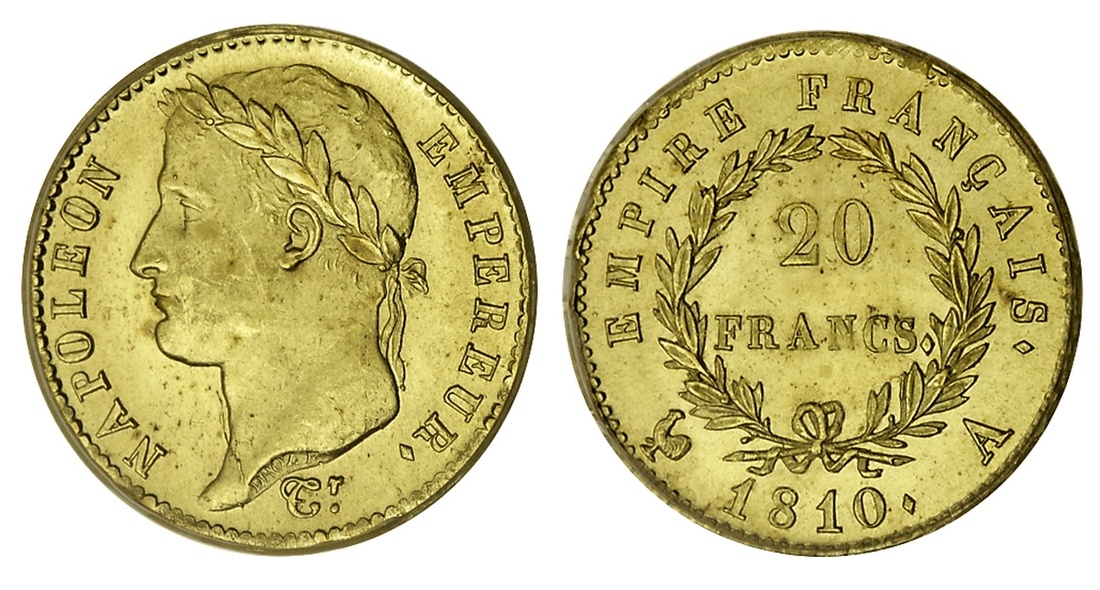 (g) France, First Empire, Napoléon Bonaparte (1804-14), gold 20-Francs, 1810-A, Paris, laureate head (Le Franc 516.8; Fb 511; Gad 1025), choice mint state, the single finest being the only example with a plus designation, in early PCGS holder, graded MS64+