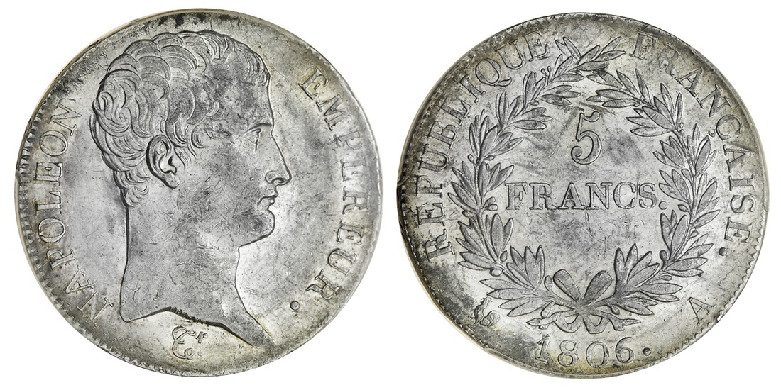 France, First Empire, Napoléon Bonaparte (1804-14), 5-Francs, 1806-A, Paris, bare head (Le Franc 304; KM 673.1), in PCGS holder, graded AU53