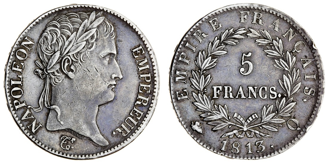 France, First Empire, Napoléon Bonaparte (1804-14), 5-Francs, 1811-Q, Perpignan {grapes} (Le Franc 307; Gad 584; KM 694.12), toned with two light edge knocks, otherwise a pleasing very fine