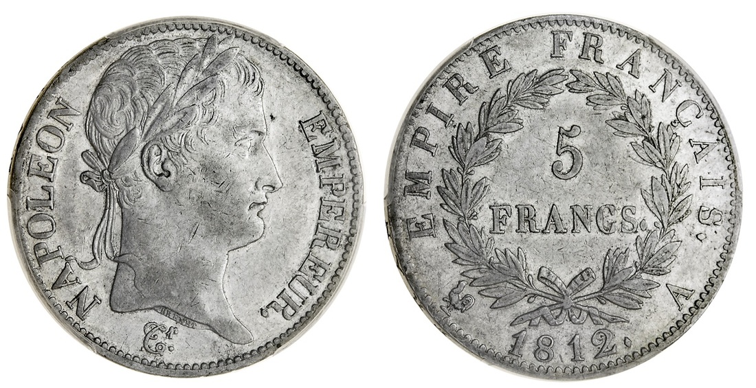 France, First Empire, Napoléon Bonaparte (1804-14), 5-Francs, 1812-A, Paris, laureate head (Le Franc 307; Gad 585; KM 694.1), in PCGS holder, graded AU55