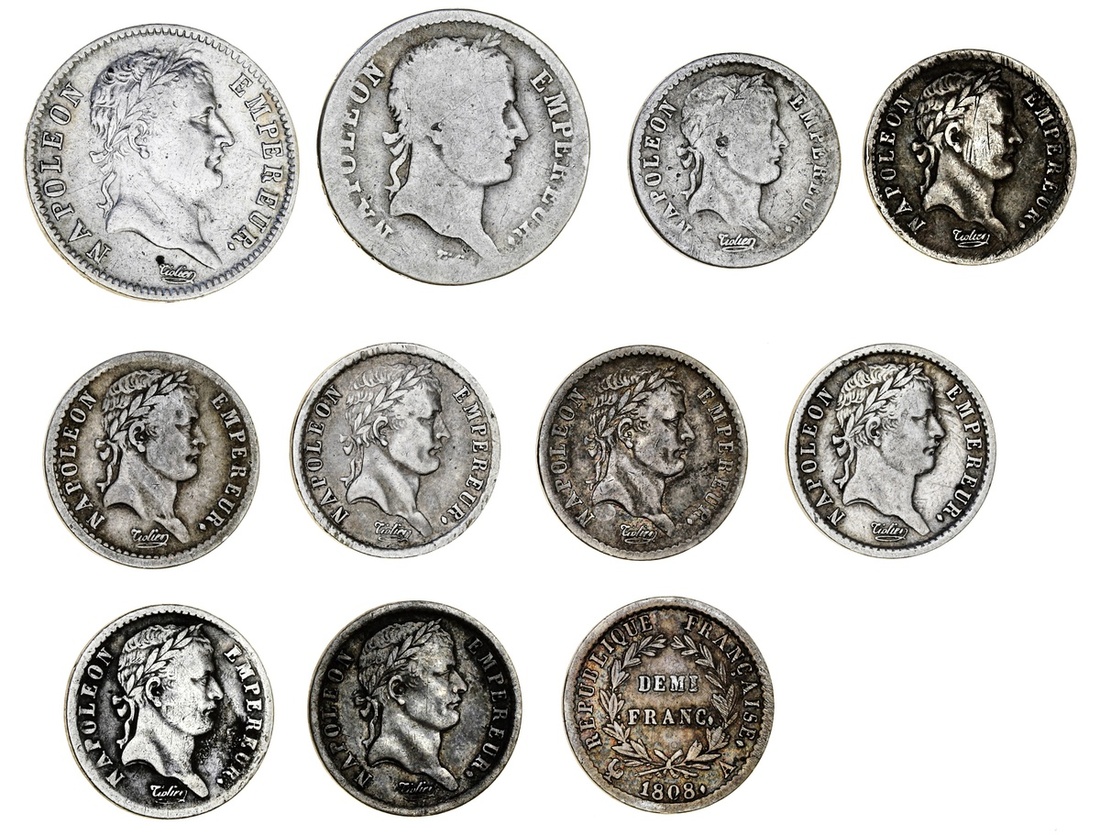 France, First Empire, Napoléon Bonaparte (1804-14), Francs [2], 1809-Q, Perpignan; another 1810-[?] (Le Franc 405; Gad 447); additionally, Demi-Francs [9], 1808 [6], Paris, -A [2]; Rouen, -B; La Rochelle, -H; Limoges, -I [2]; additionally, 1809-A; 1812-B; and 1812-H (Gad 398; KM 680), some lightly cleaned otherwise generally fine, some better, a great opportunity to acquire from this popular series [11]