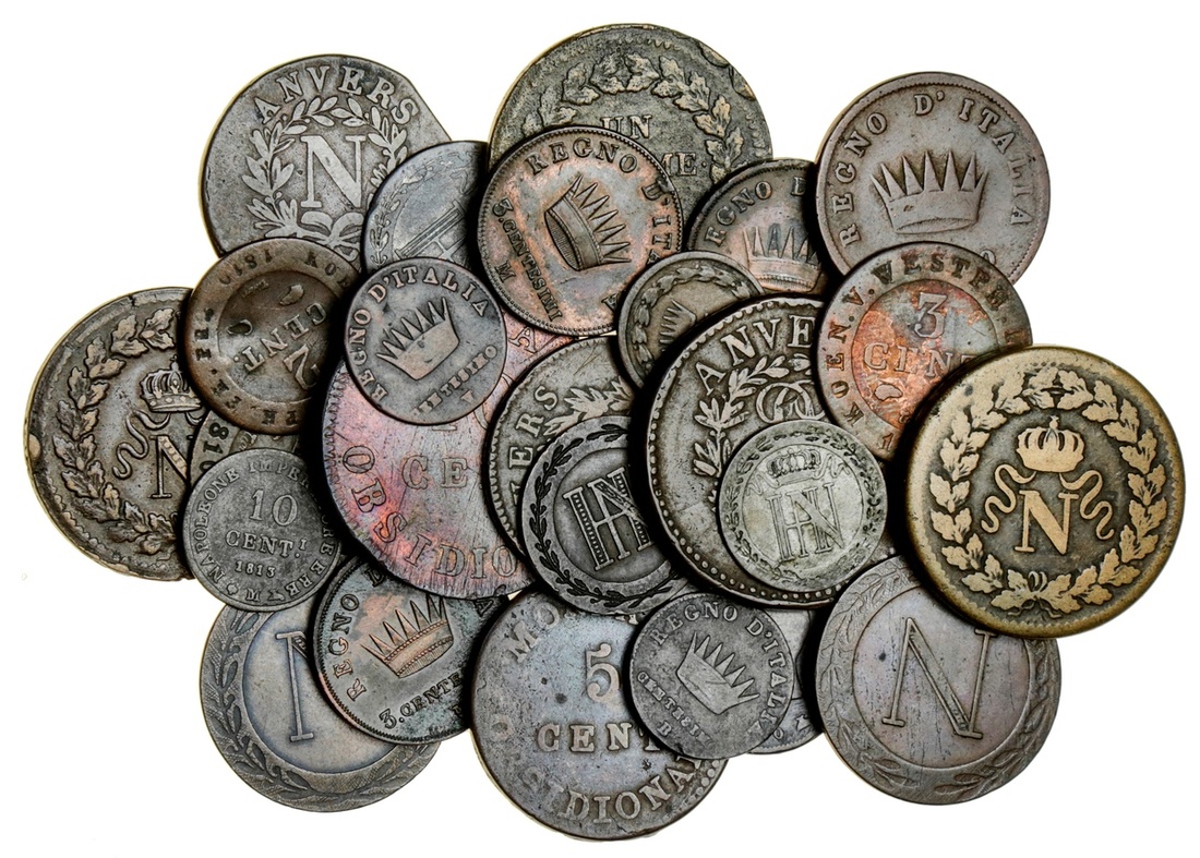 France, First Empire, Napoléon Bonaparte (1804-14), including, Strasbourg [5], Décimes, 1814-BB [3], with both legend varieties with one and two points on reverse and another on a heavier flan (Le Franc 131, 131A); also, 5-Centimes, 1808-BB [2] (Gad 127; KM 687), both good fine, collectable scarcities; Siege of Anvers {Antwerp}, 'Monnaie Obsidionale', 1814 [5], 10-Centimes [2]; also, 5-Centimes [3] (Gad 192a, d, e), generally fine with some edge bruising; also, Koln and Westphalia [6], 20-Centimes, 1810-C; 10-Centimes [3], 1808-C; 1811-M; 1813-M; 3-Centimes [2], 1809-C; 1810-C; 2-Centimes [2], 1808-J; another, 1810-C [?]; also, as King of Italy, [7], Soldo, 1812-M; 3-Centesimi [4], 1809-M; 1810-M; 1811-M; 1812-M; lastly, Centesimi [2], 1811-B; 1813-V, generally fair to fine, some cleaned or with verdigris (25)
