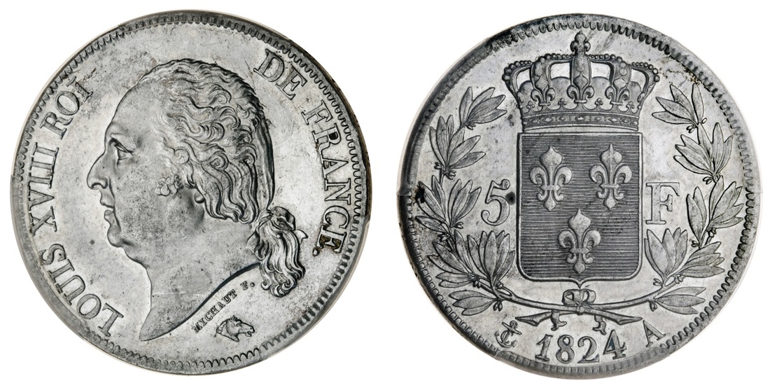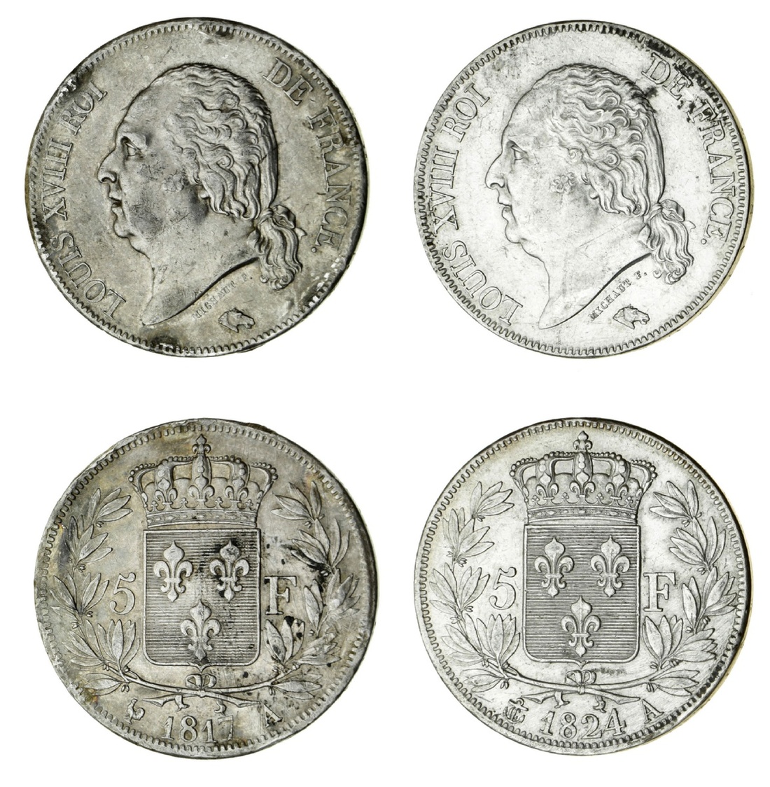 France, Restored Kingdom, Louis XVIII (1814 / 1815-24), 5-Francs, 2e type, Paris [A] (2), 1817-A {cockerel}; others, 1824-A {anchor} [2] (Le Franc 309; Gad 614; KM 711.1), all lightly wiped, otherwise a bold very fine or better, the last residually lustrous, in PCGS details holder, graded Cleaned-AU (3)