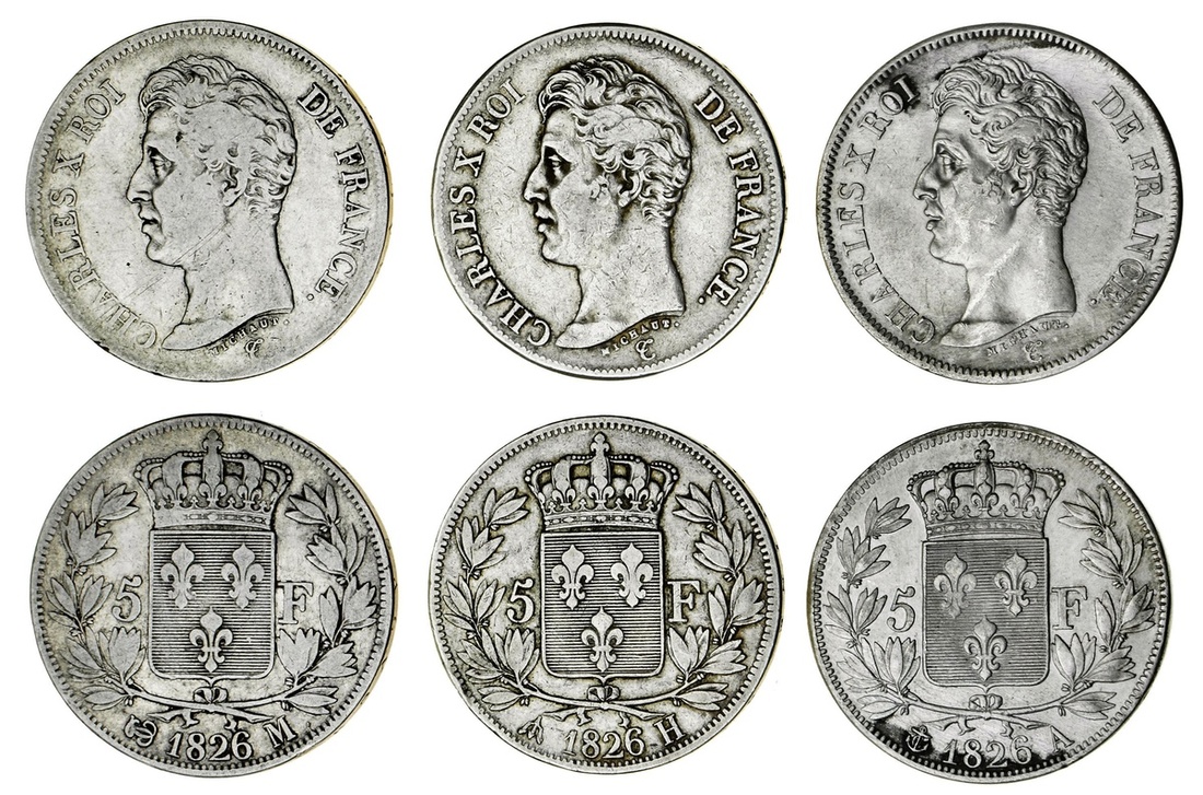 France, Restored Kingdom, Charles X (1824-30), 5-Francs, 1e type, 1826 (3), Paris {anchor}, 1826-A; La Rochelle {trident}, 1826-H; lastly, Toulouse {monogram}, 1826-M (Le Franc 310.15, 19; Gad 643; KM 720.1, 5, 9), the first harshly cleaned, otherwise very fine, the others fair to fine, all scarcer types (3)