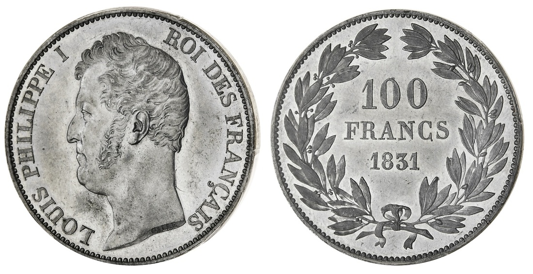 France, Restored Kingdom, Louis-Philippe I (1830-48), Pattern 100-Francs, 1831, in silver, by Galle, bare head left, rev. value within wreath (Maz 1058), very rare, especially in this metal, in PCGS holder, graded SP62