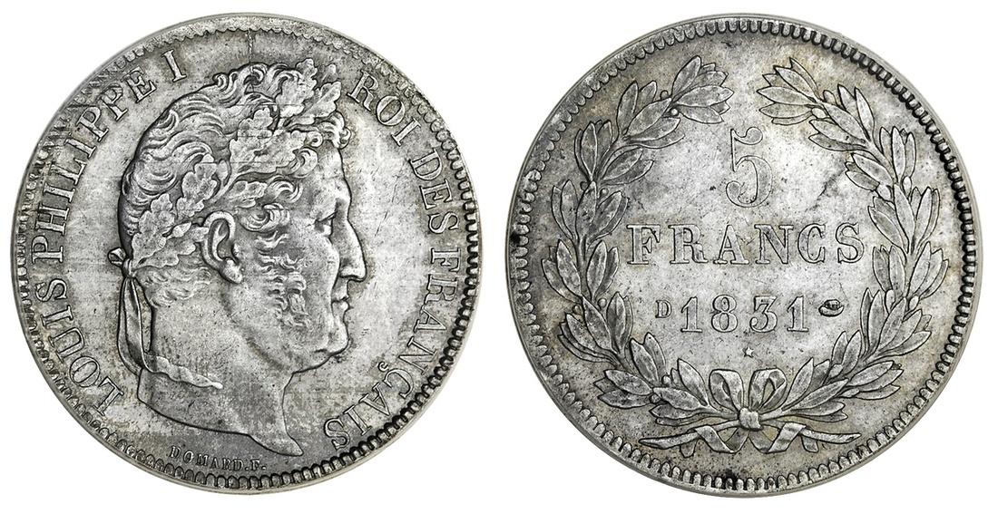 France, Restored Kingdom, Louis-Philippe I (1830-48), 5-Francs, 1831-D, Lyon, laureate head right, rev. value in wreath, edge lettering incuse (Le Franc 320; Gad. 677; KM 745.4), light tone overlying lustrous surfaces, rare thus, in early PCGS holder, graded MS62