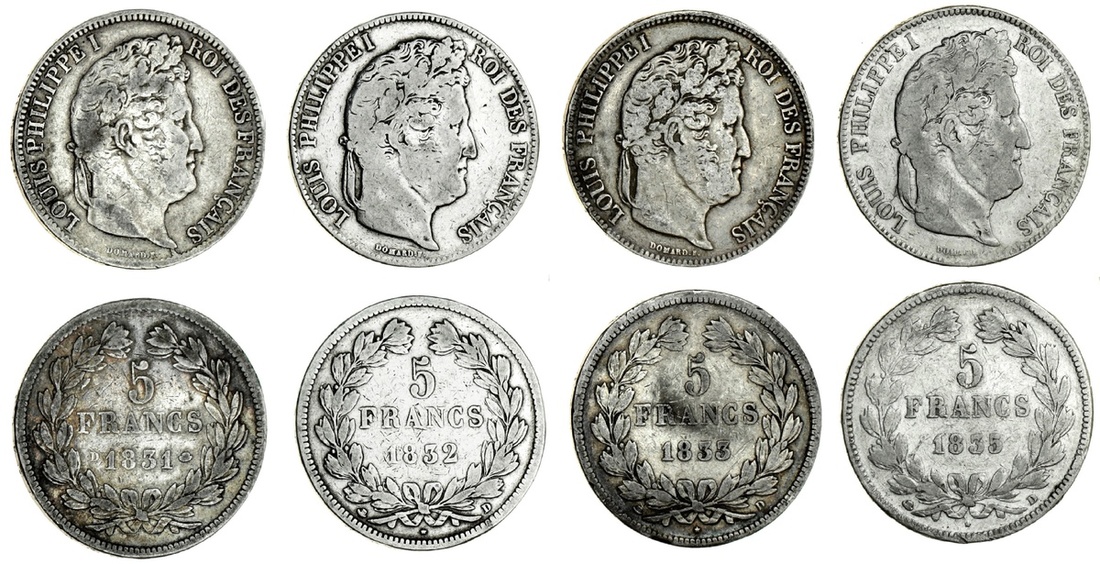 France, Restored Kingdom, Louis-Philippe I (1830-48), 5-Francs, Lyon [D] (4), transitional type, 1831-D; also, 2e type, 1832-D; 1833-D; 1835-D (Gad 678; KM 749.4), some cleaned, otherwise fine or better, all scarce (4)